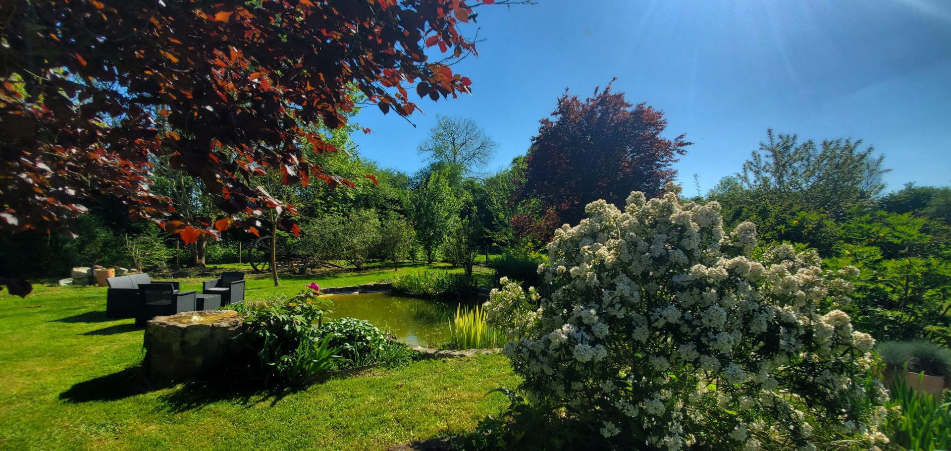 Le parc paysager dispose d'une petite mare et de deux grandes dépendances à usage de stockage.