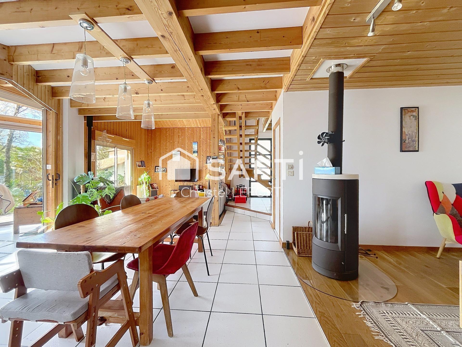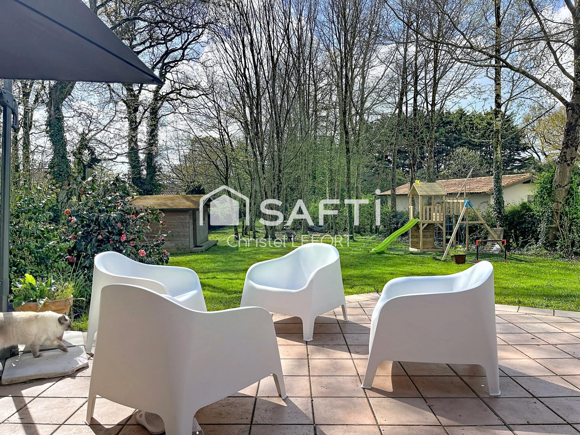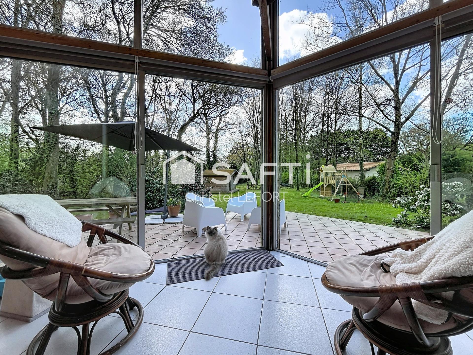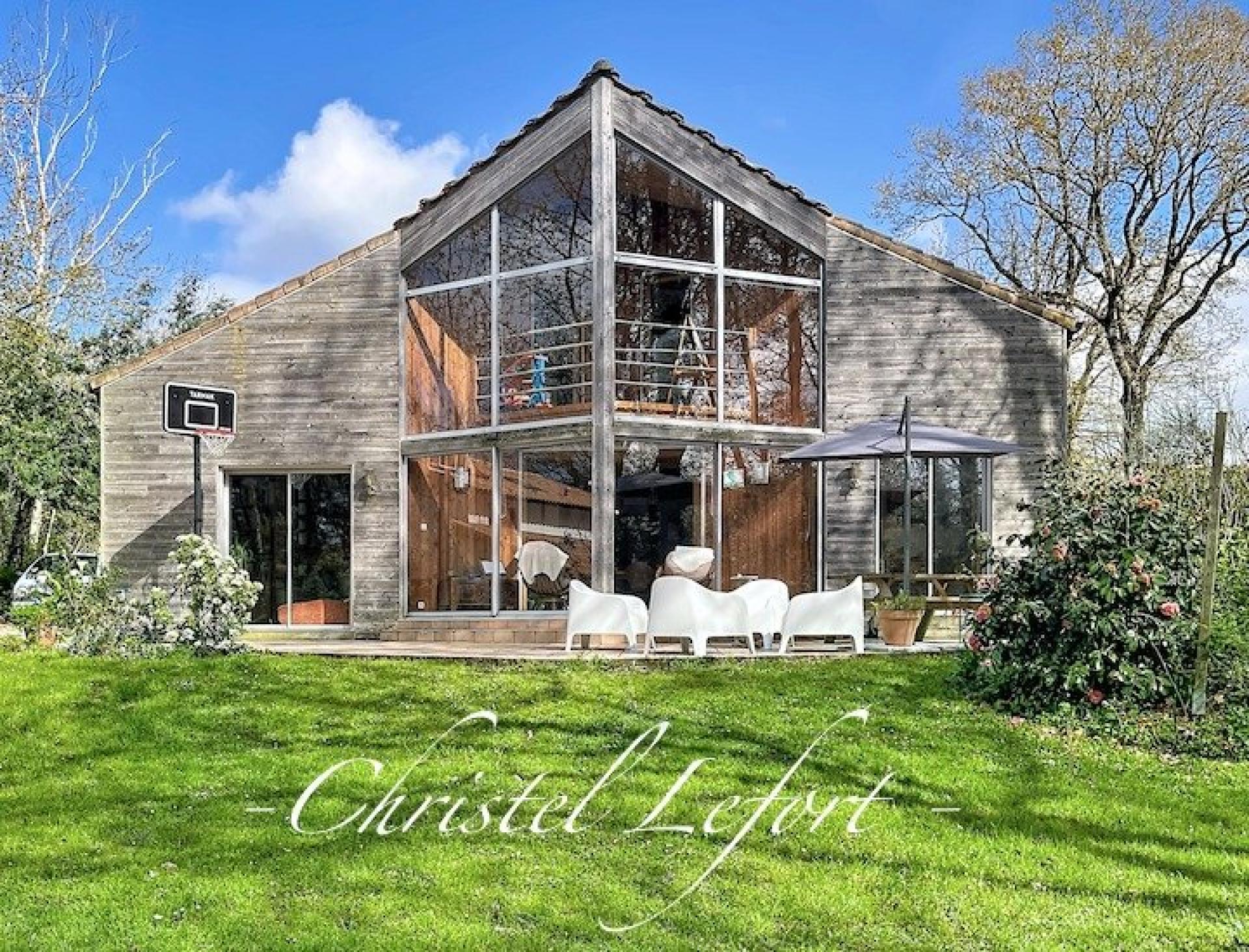 Christel Lefort vous propose en exclusivité sur Pornic, cette belle demeure d’architecte en bois de châtaignier, nichée sur un terrain arboré de 1810 m² sans vis-à-vis, idéalement située à proximité des commodités, plages et du golf à moins de 15 min à vélo. Vous serez séduits par ses volumes ouverts et sa luminosité, avec un espace de vie comprenant salon, salle à manger, espace lecture et cuisine avec cellier, prolongé par une grande véranda exposée plein sud avec accès direct au jardin et à sa terrasse de 48 m2. Le rez-de-chaussée offre également une chambre avec salle d’eau, un bureau et un WC indépendant. À l’étage, un espace bibliothèque ouvert, quatre chambres sous combles dont deux avec accès à une grande terrasse, une salle de bain et une salle d’eau avec 2 WC. Sur le terrain est présent un bungalow chauffé et aménagé, un garage de 25 m² et un carport. Le Terrain est piscinable si besoin. Ce bien est lumineux, au calme, dans la nature et à proximité immédiate de toutes les commodités.