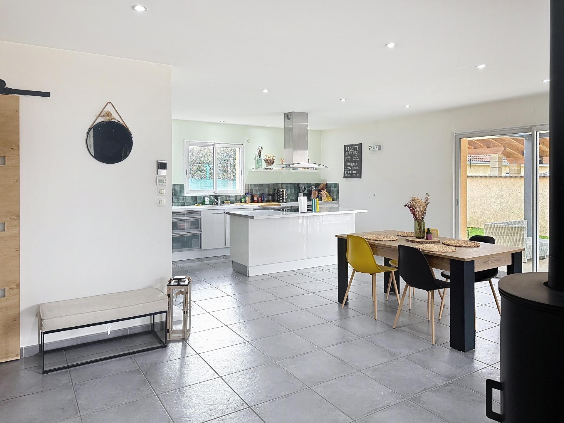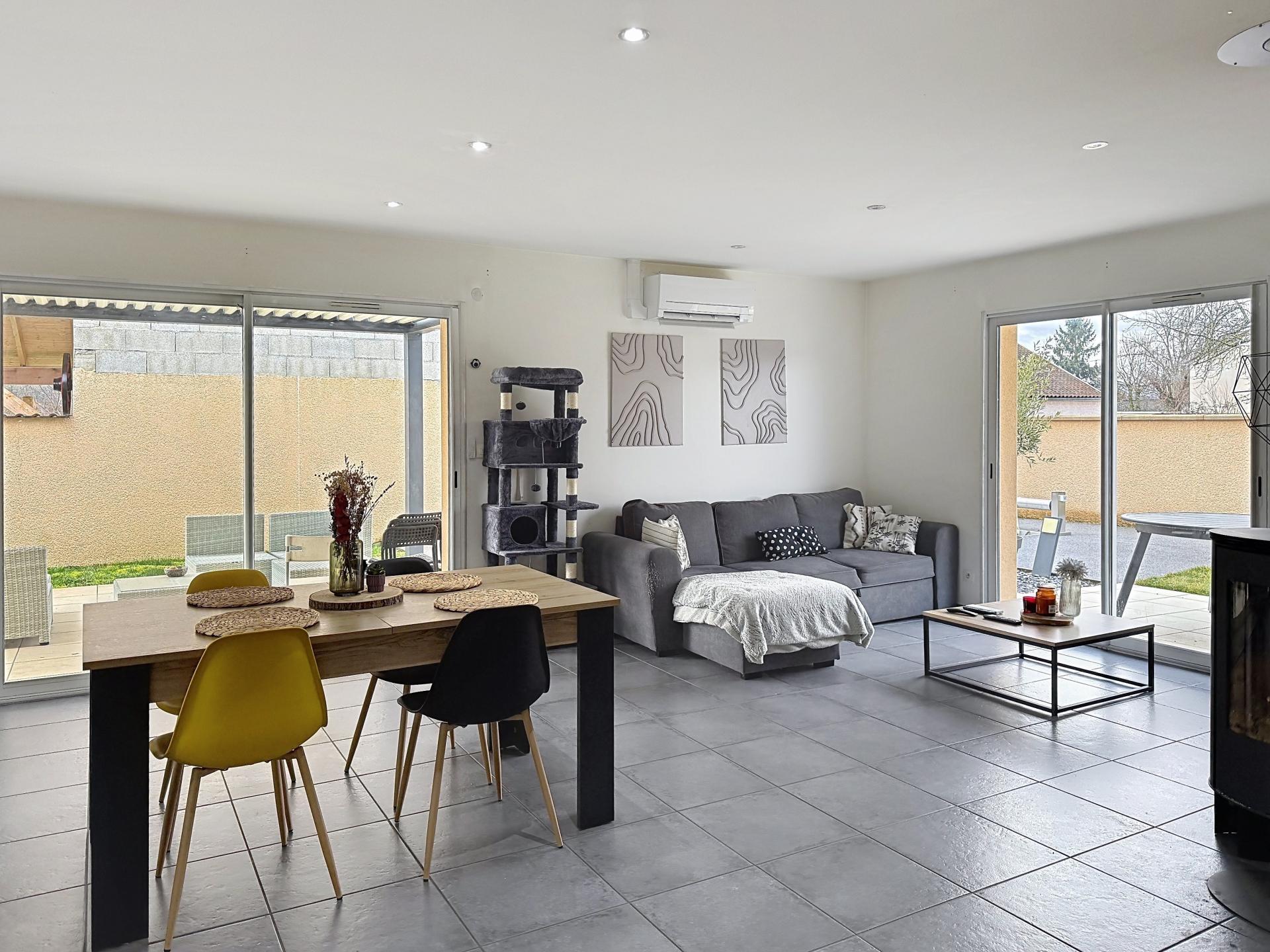 Dès les premiers instants, cette maison de plain-pied séduit par son atmosphère chaleureuse et sa belle luminosité. La pièce de vie, ouverte sur l’extérieur, invite naturellement à la convivialité et aux moments partagés, avec une vue et un accès direct sur la piscine, véritable atout pour profiter pleinement des beaux jours.