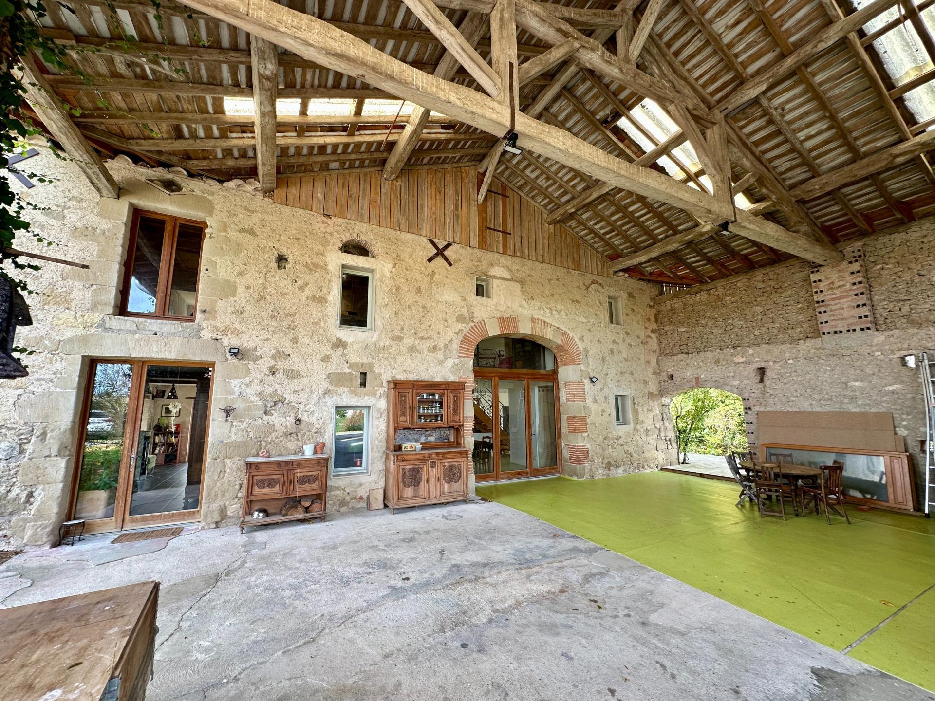 La première maison, d’environ 185 m², charme immédiatement par ses matériaux sains et naturels : enduits chaux/chanvre, chaux/lin, travertin, parquet chaleureux en châtaignier… Les volumes sont généreux, baignés de lumière, portés par de belles poutres apparentes. Deux chambres existent déjà, mais les espaces disponibles offrent un immense potentiel pour imaginer plusieurs pièces supplémentaires selon vos envies. Une grande salle d'environ 50 m² invite à devenir atelier d’artiste, salle de musique, salon de réception… tandis qu’un autre atelier d'une trentaine de m² ouvre toutes les possibilités créatives.