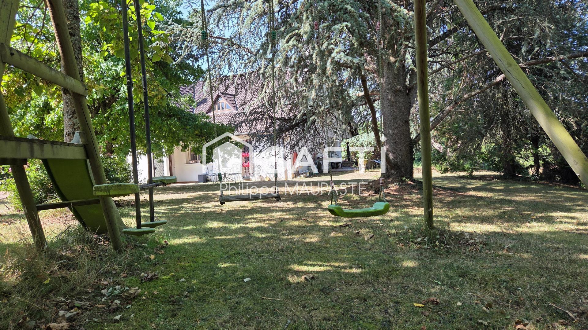 Cette maison des années 70, d'une surface habitable de 180 m², se compose de 7 pièces dont 4 chambres, 3 toilettes et 2 salles de bain. En rez-de-chaussée, on découvre une grande entrée, une salle à manger ouverte sur un salon de 50m² avec cheminée, une chambre avec suite parentale, une cuisine équipée et un WC. À l'étage, une grande mezzanine, une chambre avec balcon, une salle de bain avec baignoire et deux autres chambres offrent un espace de vie confortable. Le sous-sol abrite une cave, une chaufferie et un garage, complétant les nombreux atouts de cette propriété unique, idéale pour une vie de qualité en pleine nature.