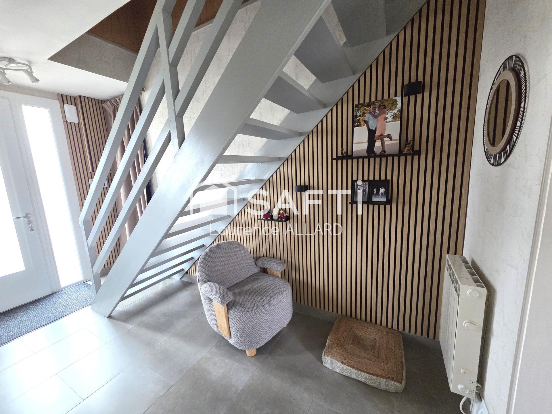 Cette charmante maison de 103 m², construite en 1986, est nichée sur un terrain de 388 m². Elle se compose de 5 pièces, dont 4 chambres et 2 salles de bain, offrant un espace de vie confortable et fonctionnel pour toute la famille. Au rez-de-chaussée, on trouve un séjour-salle à manger lumineux avec poêle à granulés sur une cuisine ouverte équipée, une chambre, une salle de bain balnéo-salle d'eau, et un wc séparé. A l'étage, deux chambres dont une avec salle d'eau et wc, ainsi qu'une chambre supplémentaire au-dessus du garage.