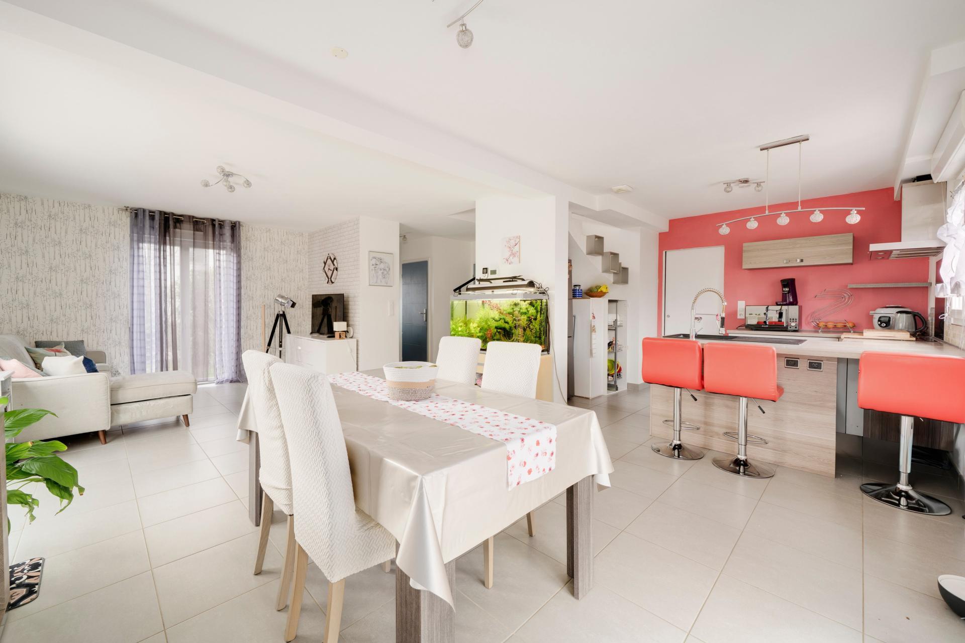 Au rez-de-chaussée, vous trouverez une cuisine ouverte sur un grand salon-séjour lumineux avec un accès direct à la terrasse et au jardin, idéal pour profiter des beaux jours.