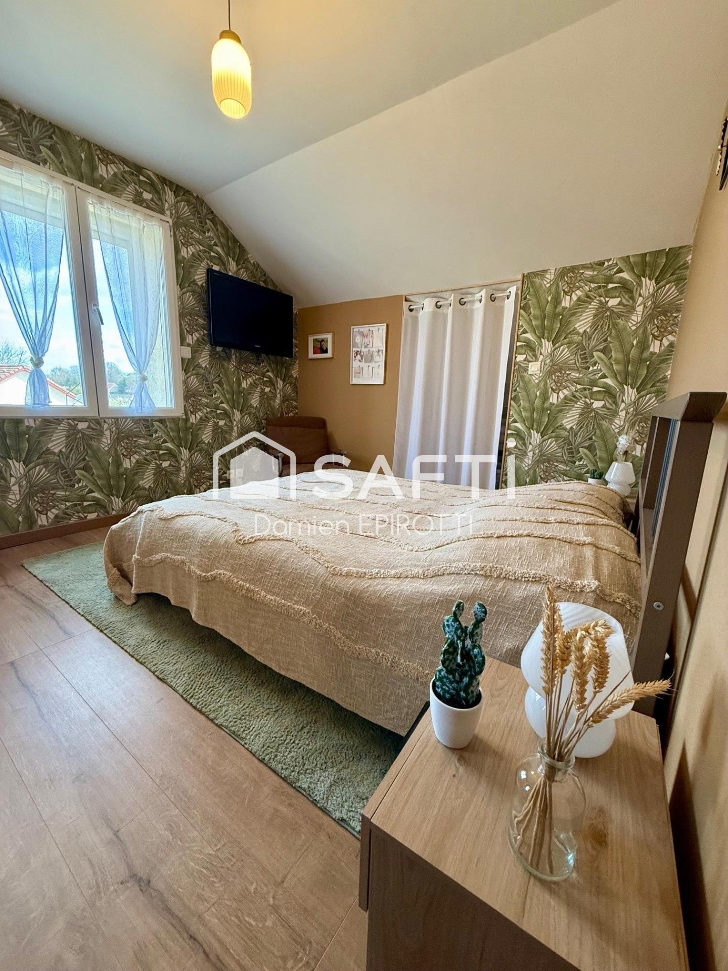 À l’étage, deux chambres joliment décorées offrent un espace nuit chaleureux et agréable.