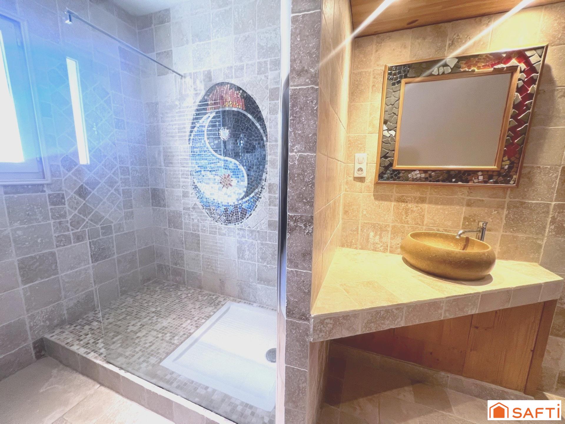 Le charme de la pierre, la toiture triple génoise et les finitions de qualité (moquette de pierres, travertin, mosaïque...) confèrent à cette demeure une élégance provençale intemporelle.