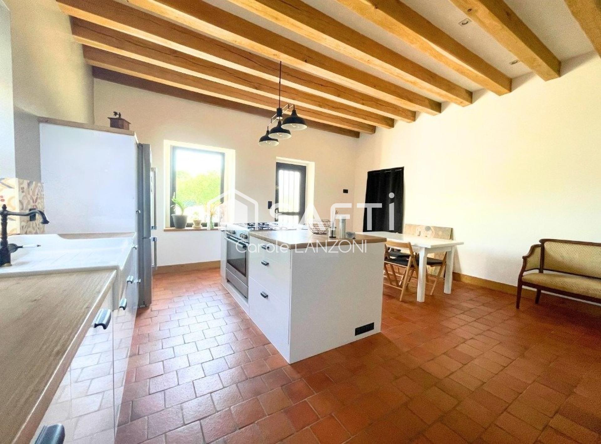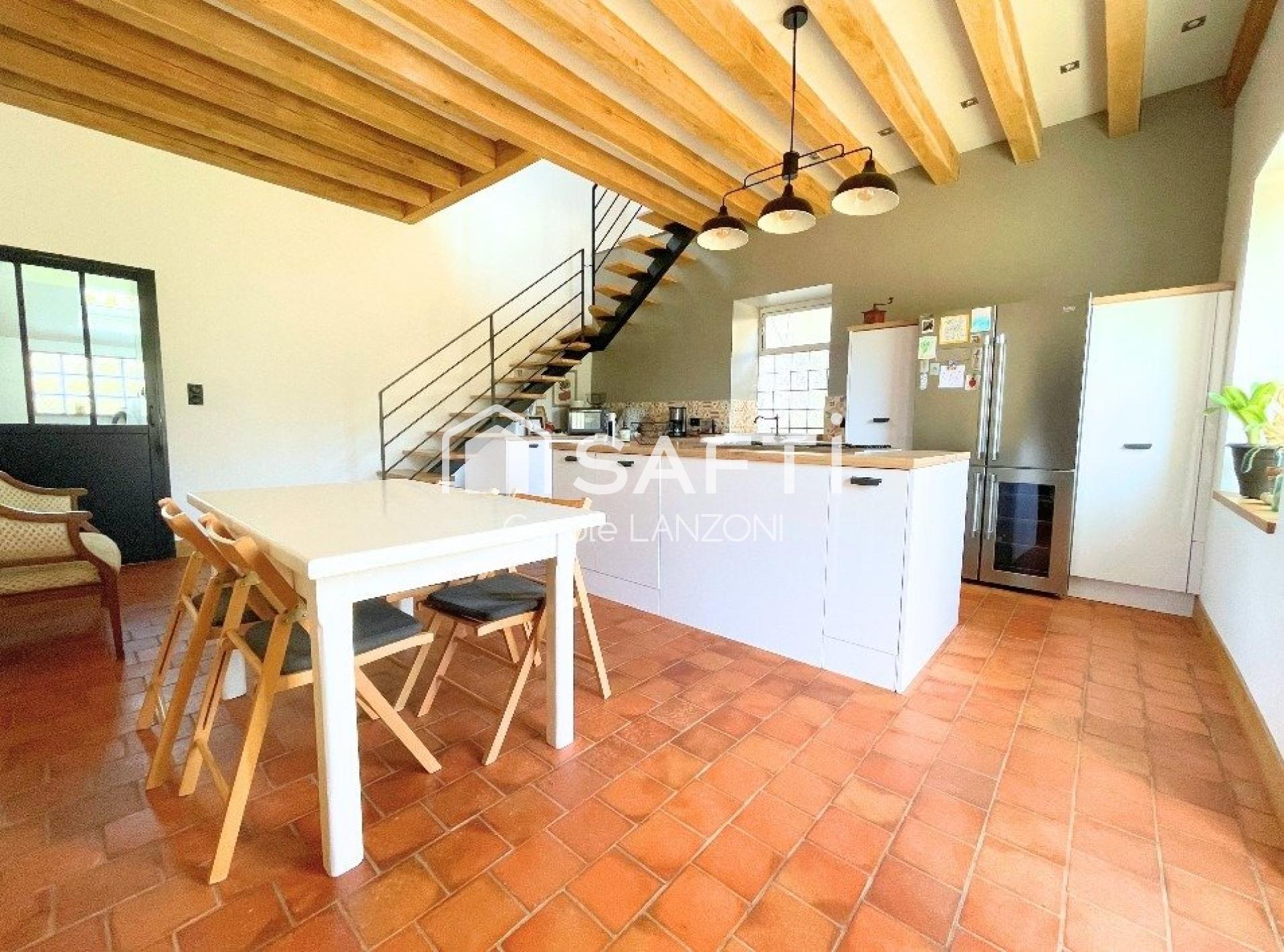 La partie droite, entièrement rénovée (env. 67 m²), offre un confort moderne tout en conservant le charme de l’ancien : cuisine équipée avec îlot central, SDE à l’esprit rétro, buanderie et WC.
