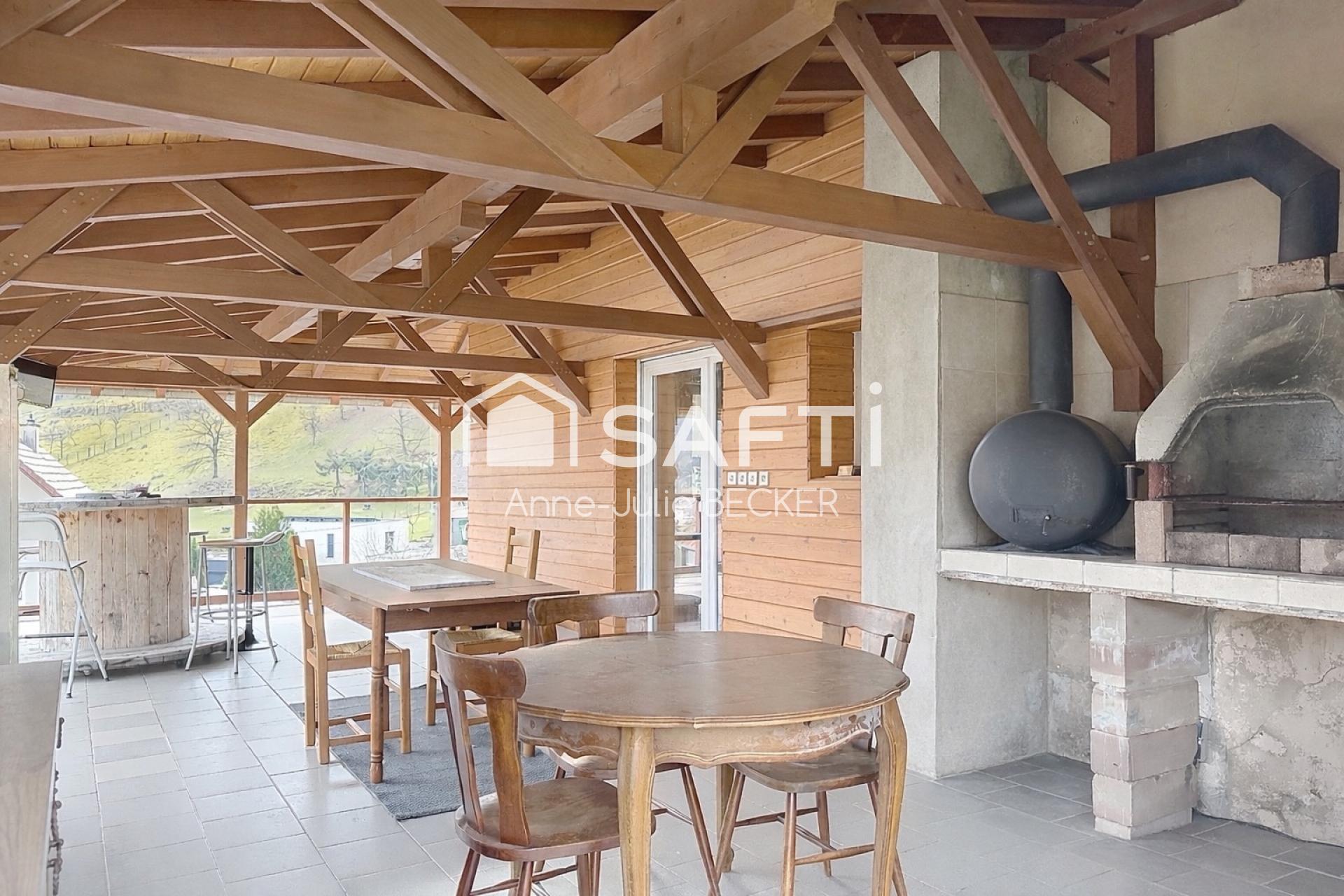 la terrasse couverte s’impose comme une véritable pièce de vie à part entière. Spacieuse, abritée et tournée vers la nature, elle est sublimée par une belle charpente apparente, qui renforce son authenticité.
