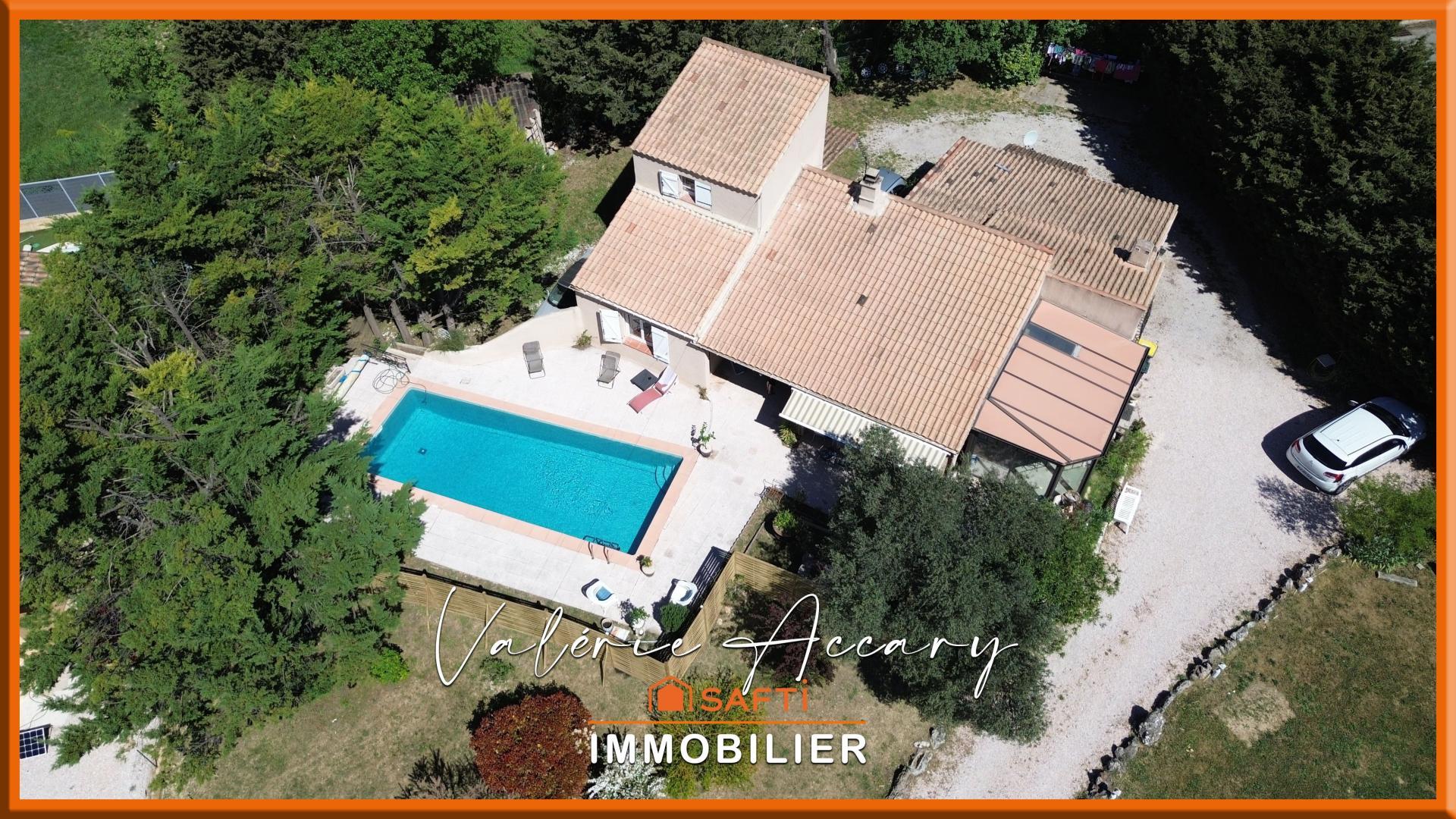Nouveauté Rocbaron: Valérie Accary vous propose en exclusivité, dans un quartier agréable, à proximité immédiate des écoles et des commodités, cette charmante villa de construction traditionnelle, majoritairement de plain-pied, de 110 m², accompagnée d’une dépendance d’environ 20 m², le tout sur un superbe terrain arboré de 1718 m². La maison principale se compose d’une entrée, d’un salon-séjour lumineux et d’une cuisine indépendante, l’ensemble ouvrant sur une magnifique véranda d’environ 20 m² ainsi qu’une terrasse couverte, idéale pour profiter de repas en extérieur au bord de la piscine. L’espace nuit offre deux chambres de 13 m² et 14 m², une salle d’eau avec douche à l’italienne, un WC indépendant ainsi qu’une troisième chambre à l’étage de plus de 16 m².