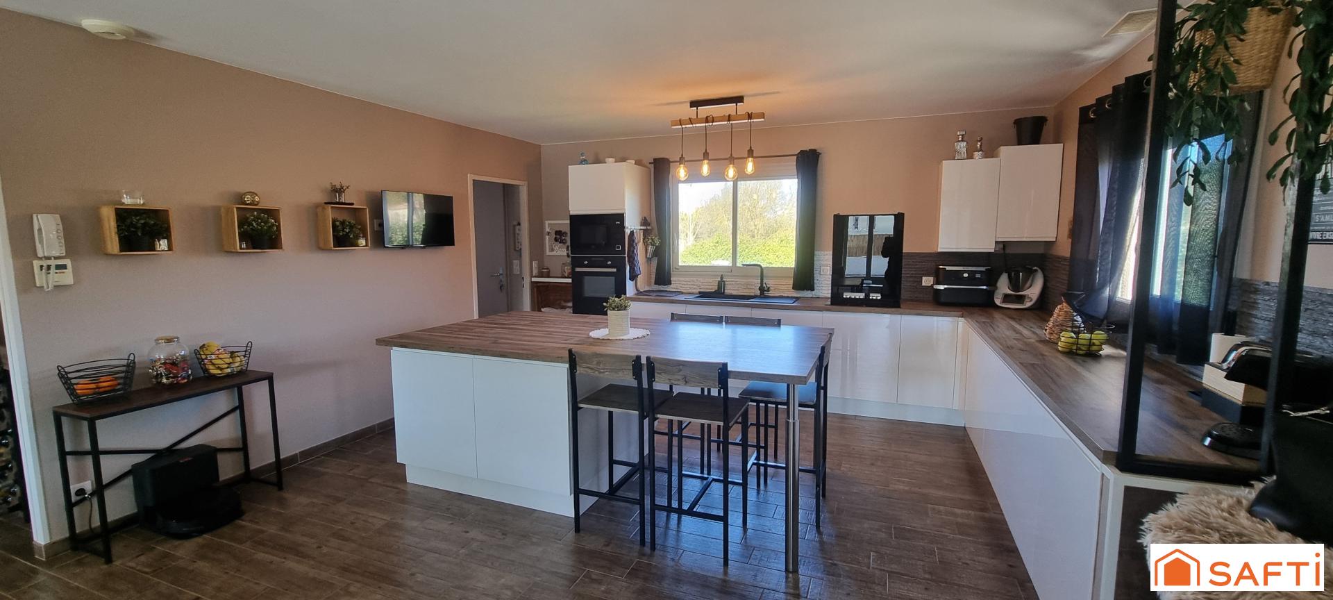 Cette maison sur vide sanitaire propose une pièce de vie baignée de lumière avec cuisine ouverte (équipée et aménagée) pour une surface totale de 56m², un grand espace buanderie, quatre chambres dont une suite parentale de 21m² avec grand dressing et salle d'eau, un bureau, 2 WC et une seconde salle d'eau.
