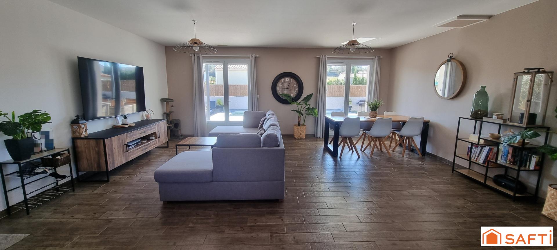Côté extérieur, une belle terrasse abritée d'une pergola bioclimatique pour d'agréables soirées en famille, une piscine de 7x3,50, une cuisine d'été équipée, un garage, un terrain de pétanque ainsi que le studio indépendant climatisé (pouvant également servir de local professionnel), un puits. Le tout sur une parcelle de plus de 820m² entièrement clôturée et sans vis-à-vis.