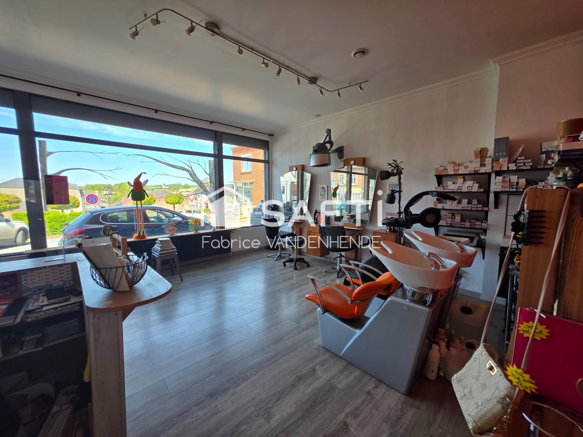 Le rez-de-chaussée accueille un local commercial lumineux avec vitrine récente, actuellement exploité en salon de coiffure, ainsi qu’un espace habitation indépendant comprenant une cuisine ouverte sur séjour avec poêle à bois, une terrasse fermée exposée plein sud et un WC. À l’étage, deux chambres disposent chacune de leur salle de bain, avec un palier aménagé en dressing. Les combles, déjà isolés, restent aménageables. Une cave en sous-sol complète l’ensemble.