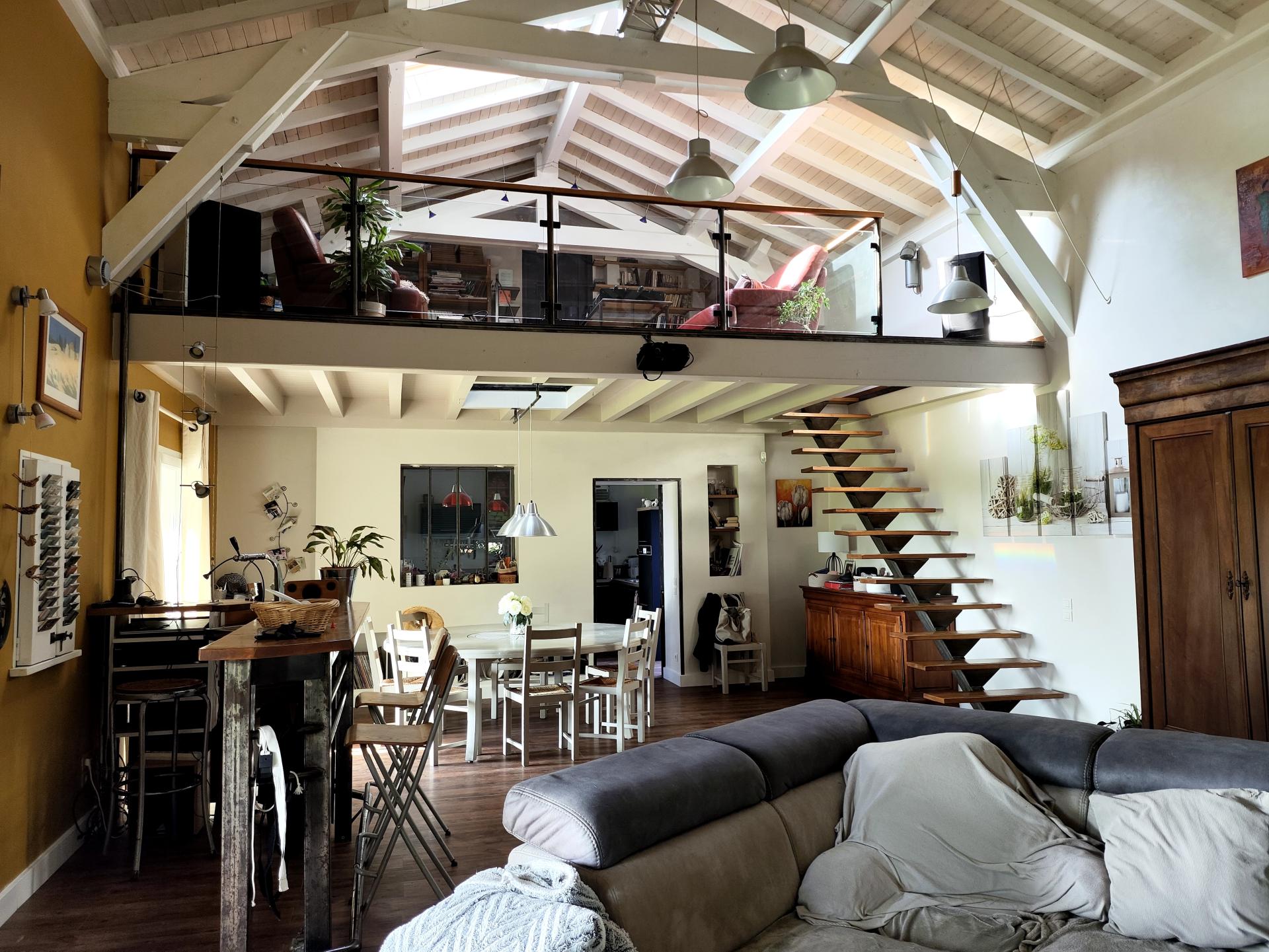 Une mezzanine lumineuse au dessus du sejour, équipée de velux et de volets roulants solaires, ainsi qu'une chambre avec salle d'eau et son WC.