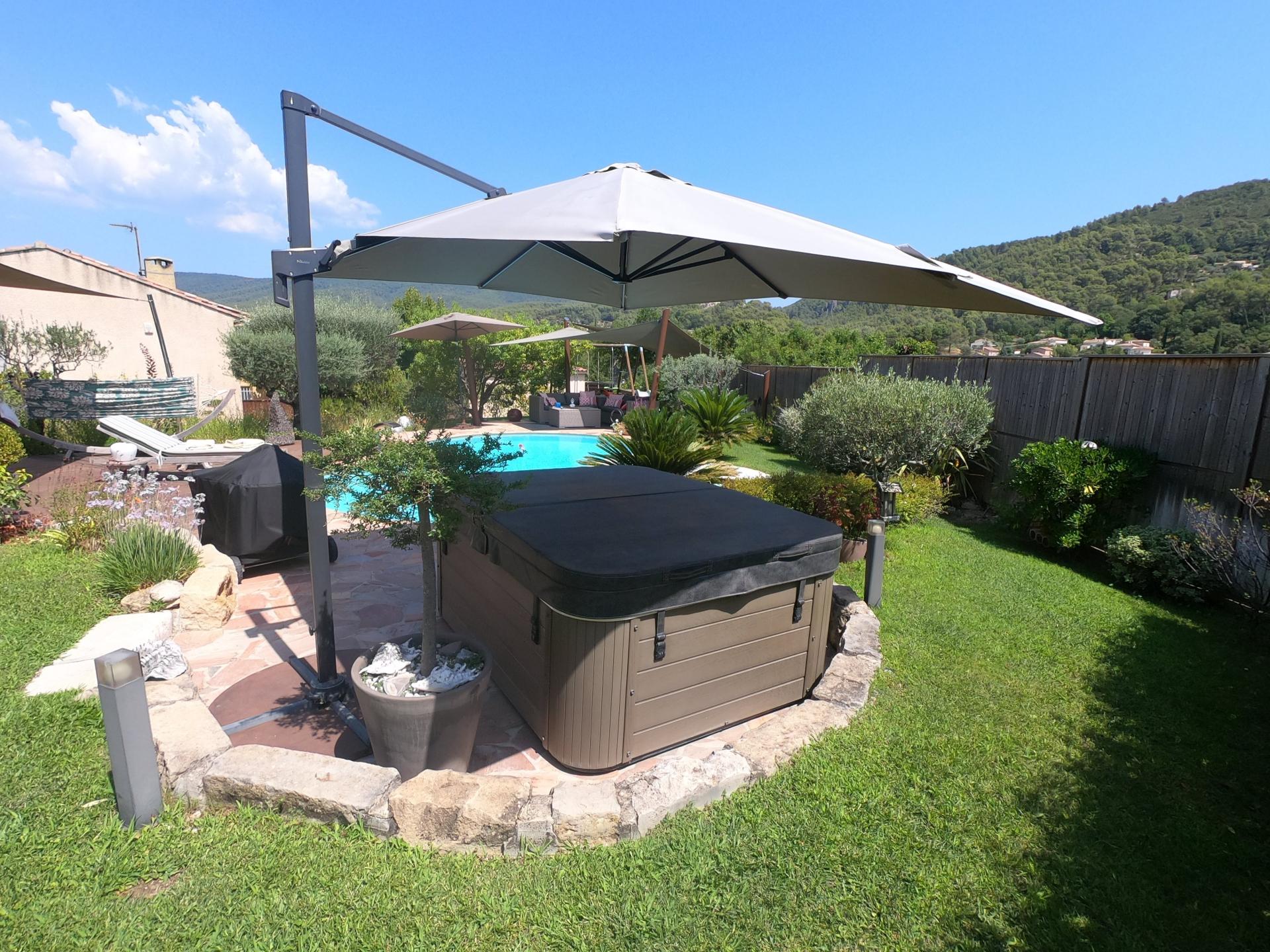 À l'extérieur, le terrain de 800 m² est soigneusement aménagé, doté d'un jardin joliment arboré qui entoure une piscine à débordement en forme libre. Une grande cuisine d'été complète cet espace convivial.