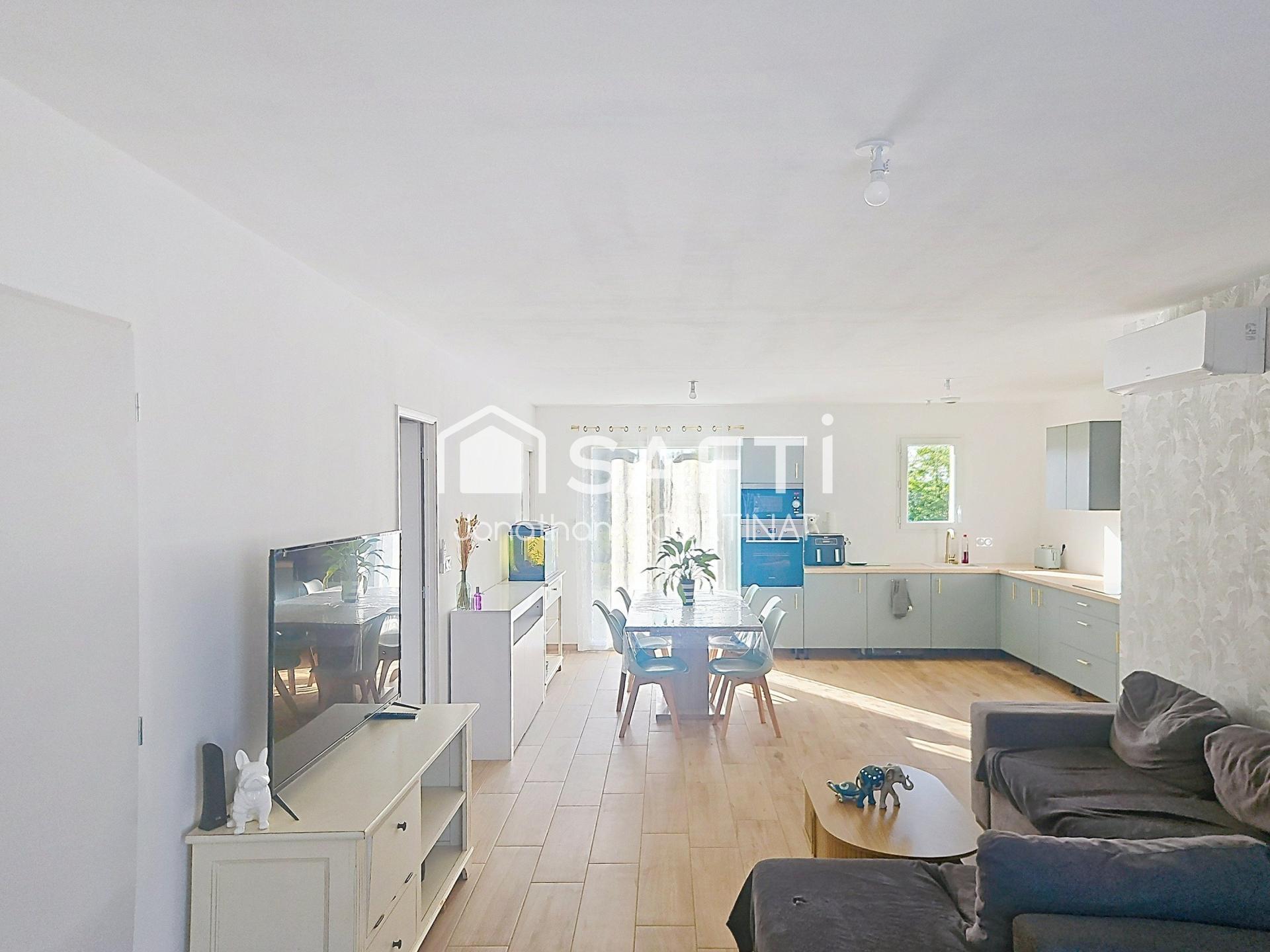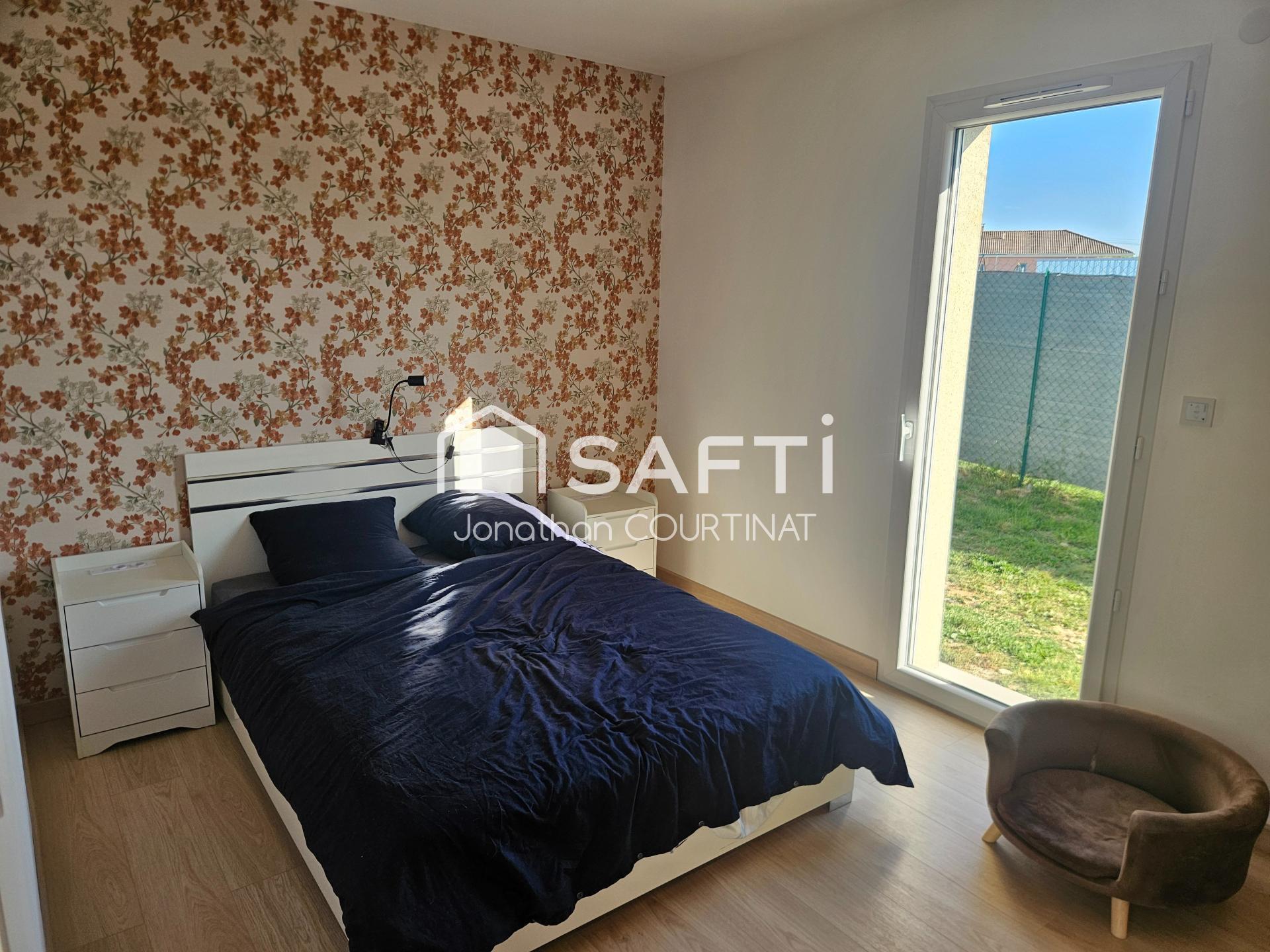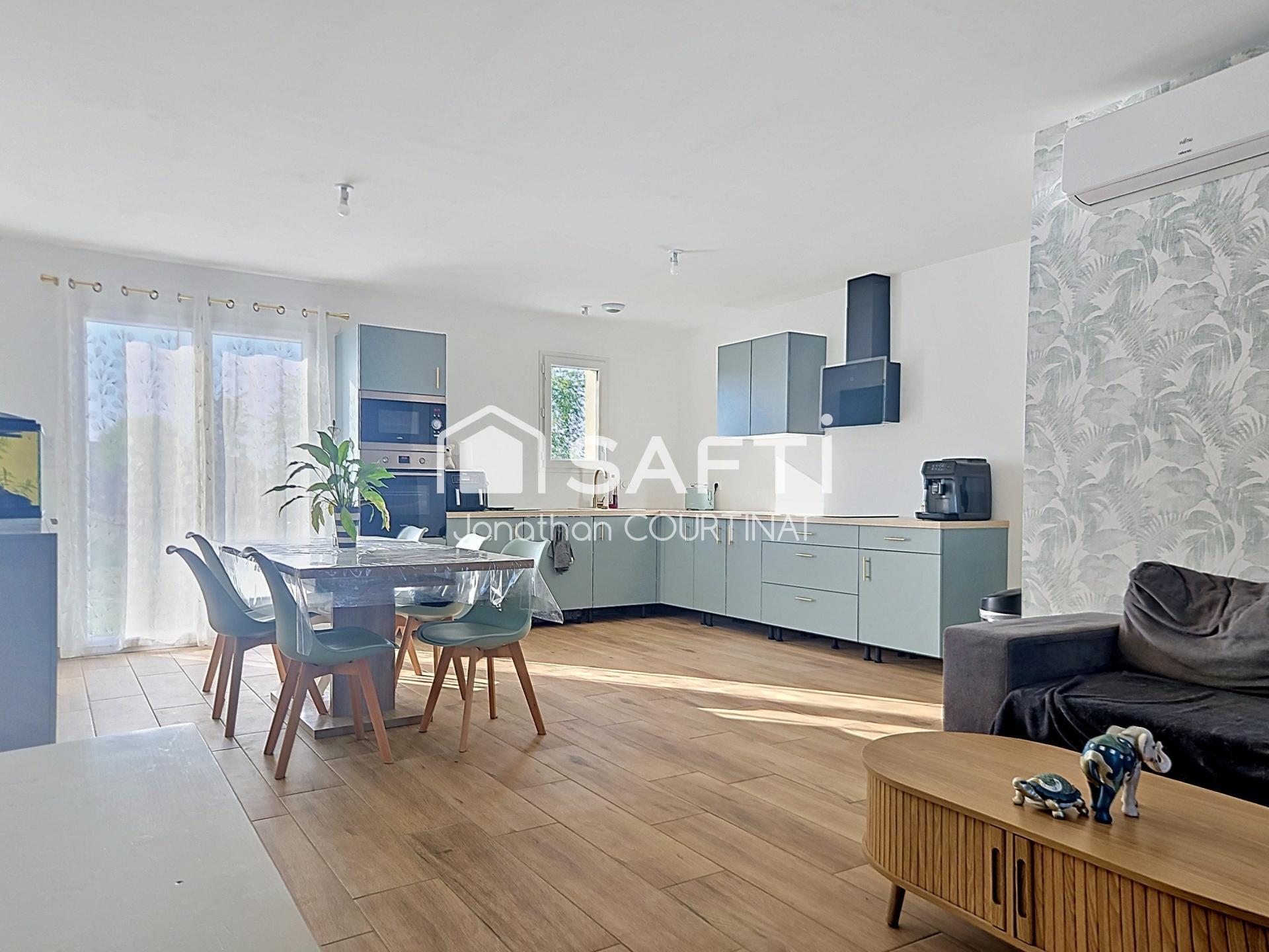 Maison neuve plain-pied 73m² + 14m² aménageables en suite parentale, sur 1500 m² clôturés. Impasse au calme, PAC réversible, ballon thermo.