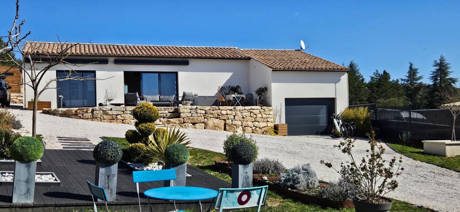 En Haute-Provence, dans le parc naturel du Luberon, sur la commune de Saint-Etienne-Les-Orgues, maison contemporaine neuve construite par un artisan maçon en 2023 et agrandie en 2025.