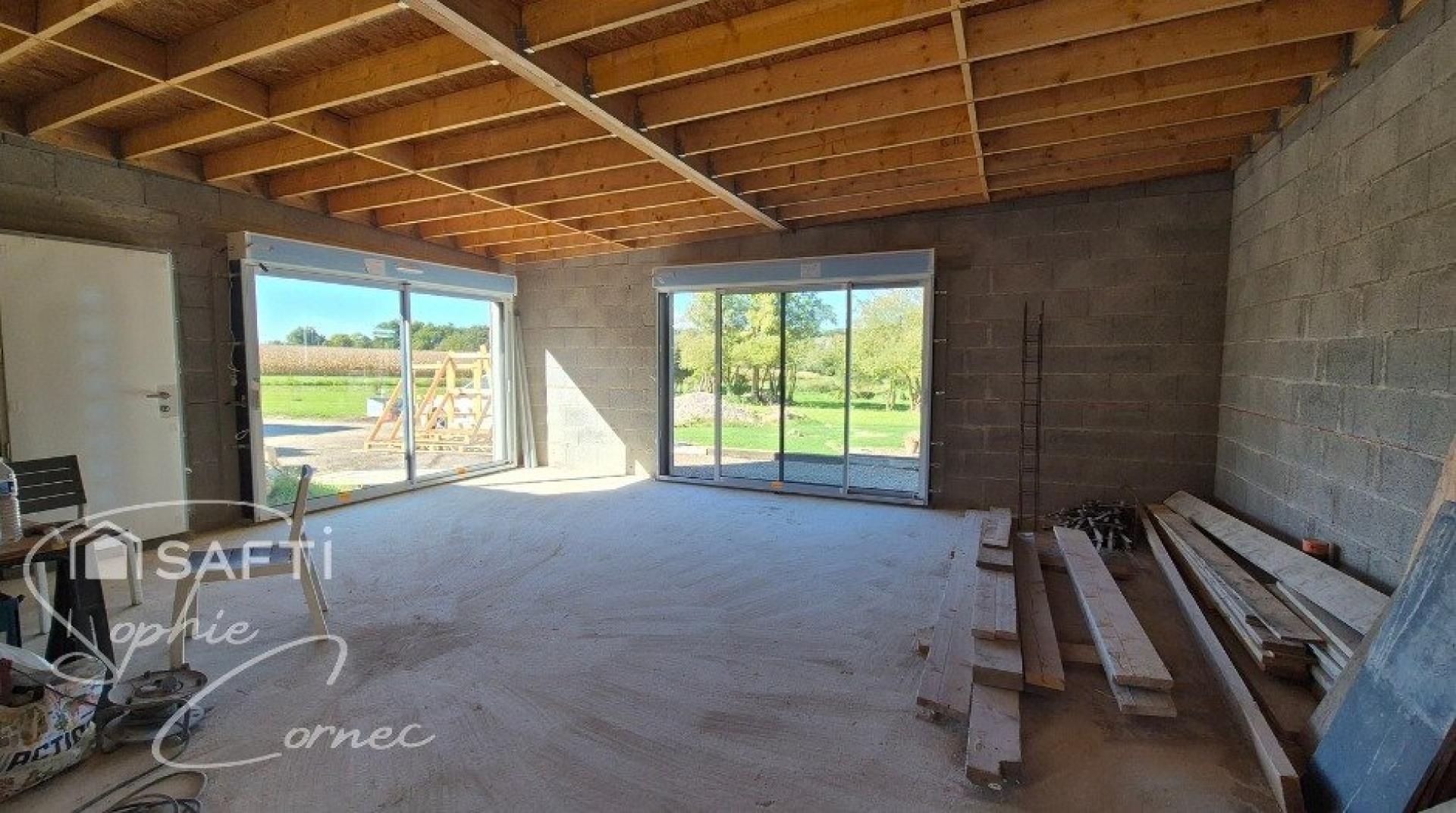 Une longère en cours de rénovation avec construction d'une extension qui offre une vue sur la campagne. Très beau travail de maçonnerie, charpente et couverture neuves : ardoises et crochets inox , toit plat extension. Les huisseries en alu avec volets électriques en alu sont posées. Les réseaux sont à proximités de la maison. L'assainissement individuel est fait, il restera le raccordement des eaux de pluie. Le projet : un salon et séjour, une cuisine, un local technique avec buanderie et chauffe-eau, une salle d'eau, un wc, une chambre avec dressing ; à l'étage une mezzanine pour bureau ou couchage qui peut être fermé, une chambre. Le tout est sur un terrain de 780m².