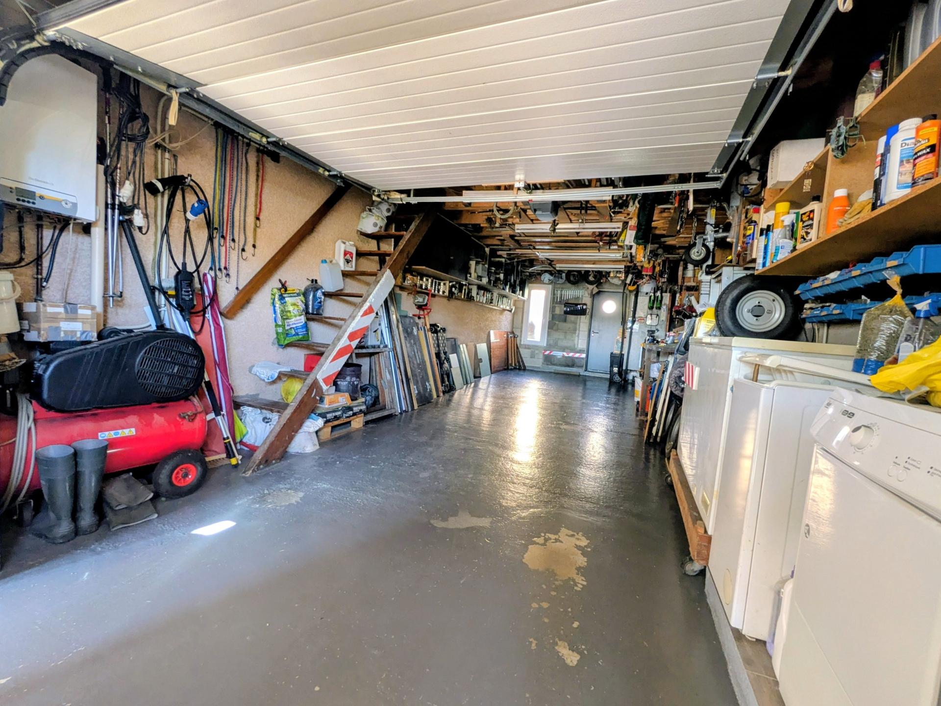 Un garage de 35m² pouvant accueillir deux véhicules, complété par une mezzanine de stockage et un carport, vient parfaire l’ensemble.