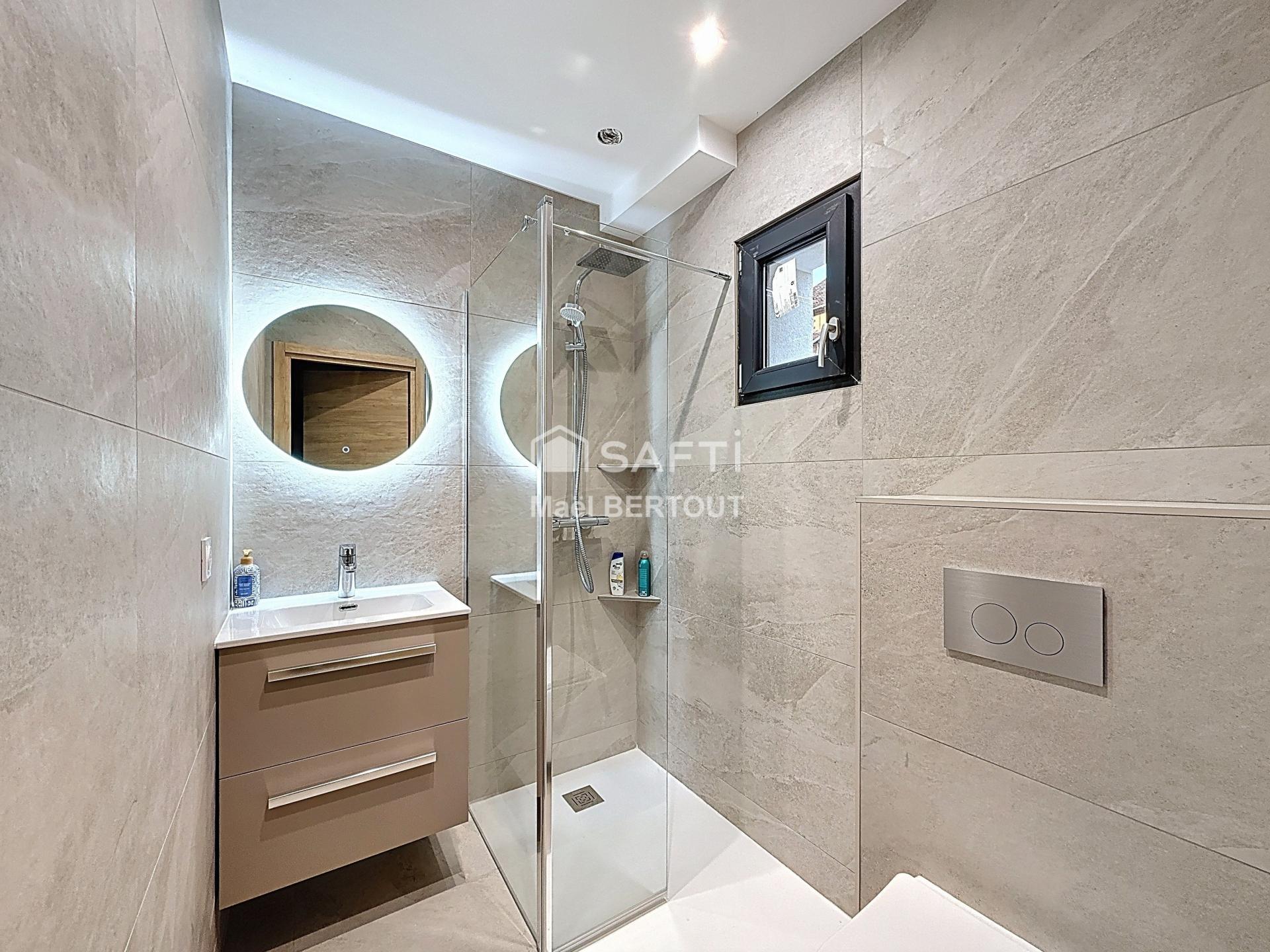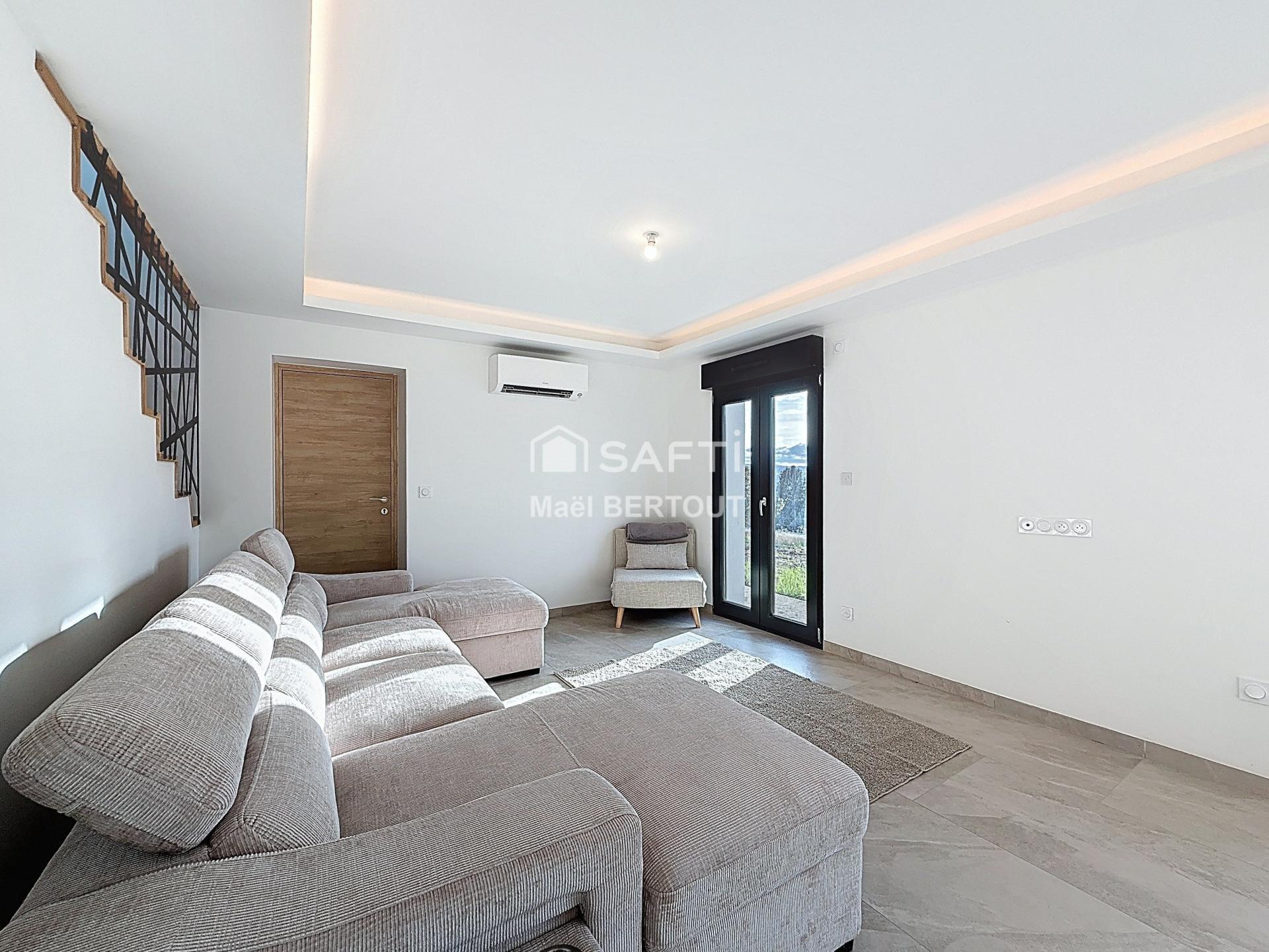 L’intérieur se développe sur deux niveaux. Le rez-de-chaussée accueille un hall d’entrée avec salle d’eau ainsi qu’une cuisine ouverte sur un vaste séjour lumineux, créant un espace de vie convivial et fonctionnel.