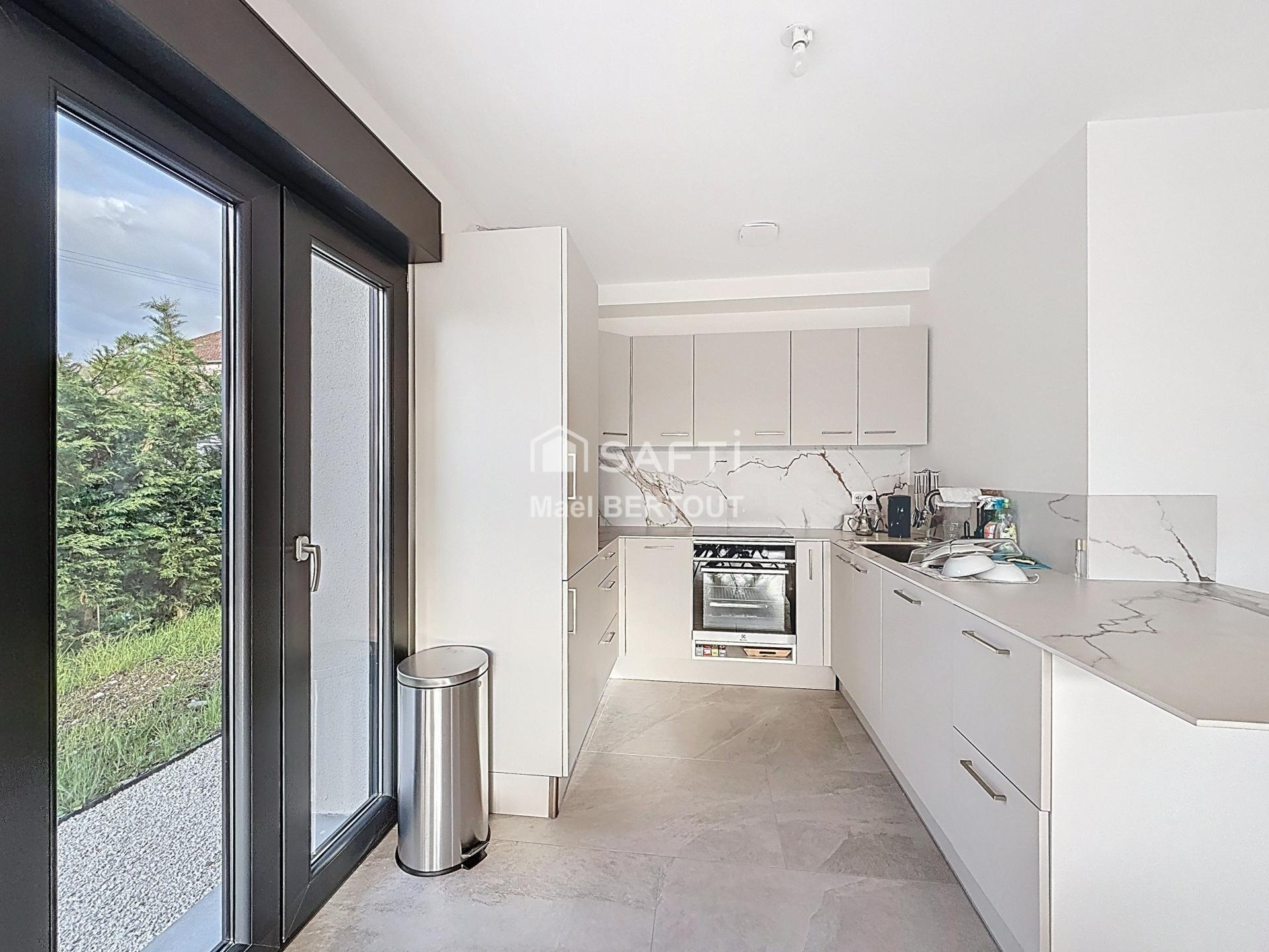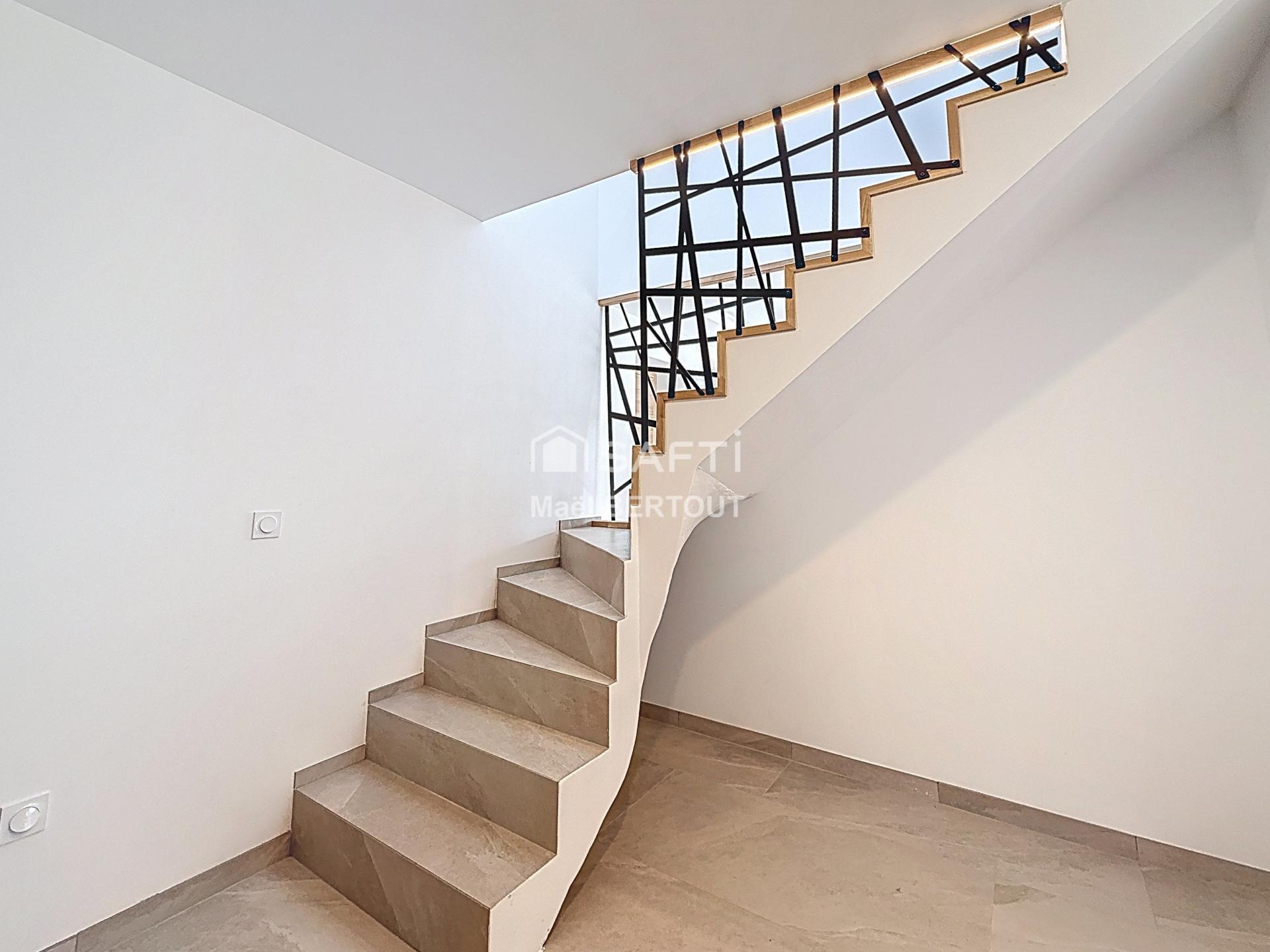 À l’extérieur, la propriété propose un jardin à aménager selon vos envies, une façade contemporaine aux lignes épurées ainsi qu’une toiture-terrasse offrant une vue dégagée sur les environs. Les larges baies vitrées et les portes-fenêtres favorisent une belle luminosité naturelle et renforcent le caractère moderne de l’ensemble.