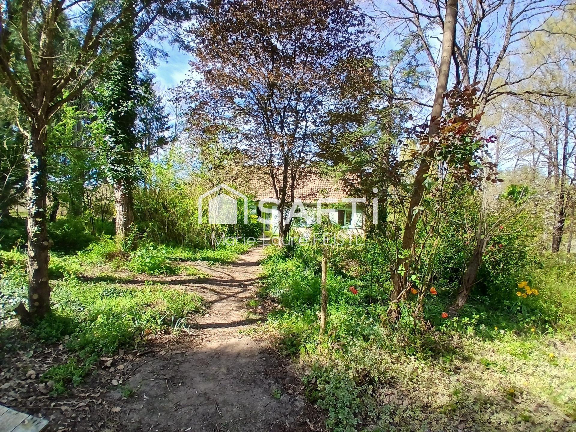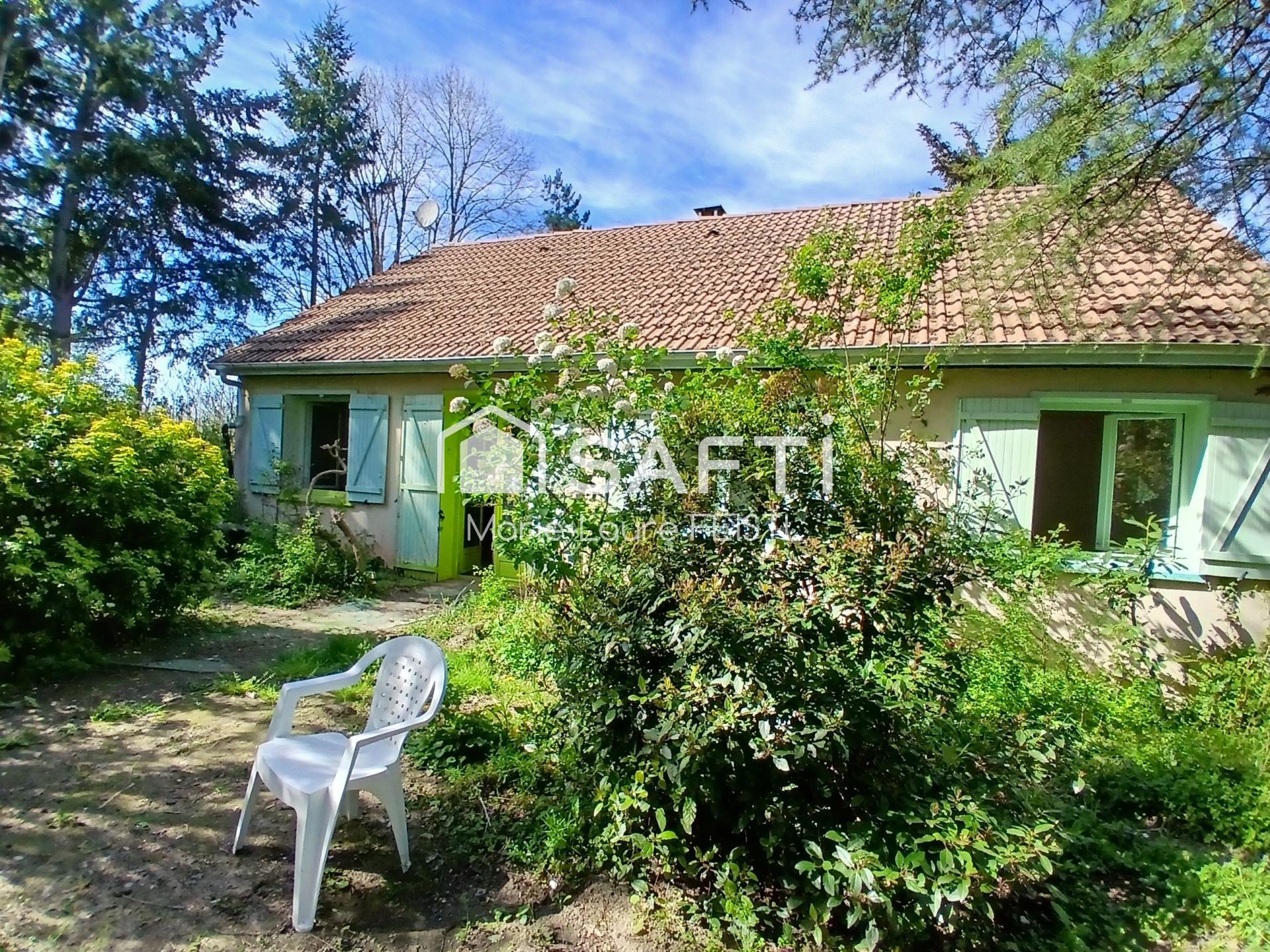 Maison de plain-pied avec sous-sol, 3 chambres, terrain boisé de 4000 m², au calme, beau potentiel après travaux.