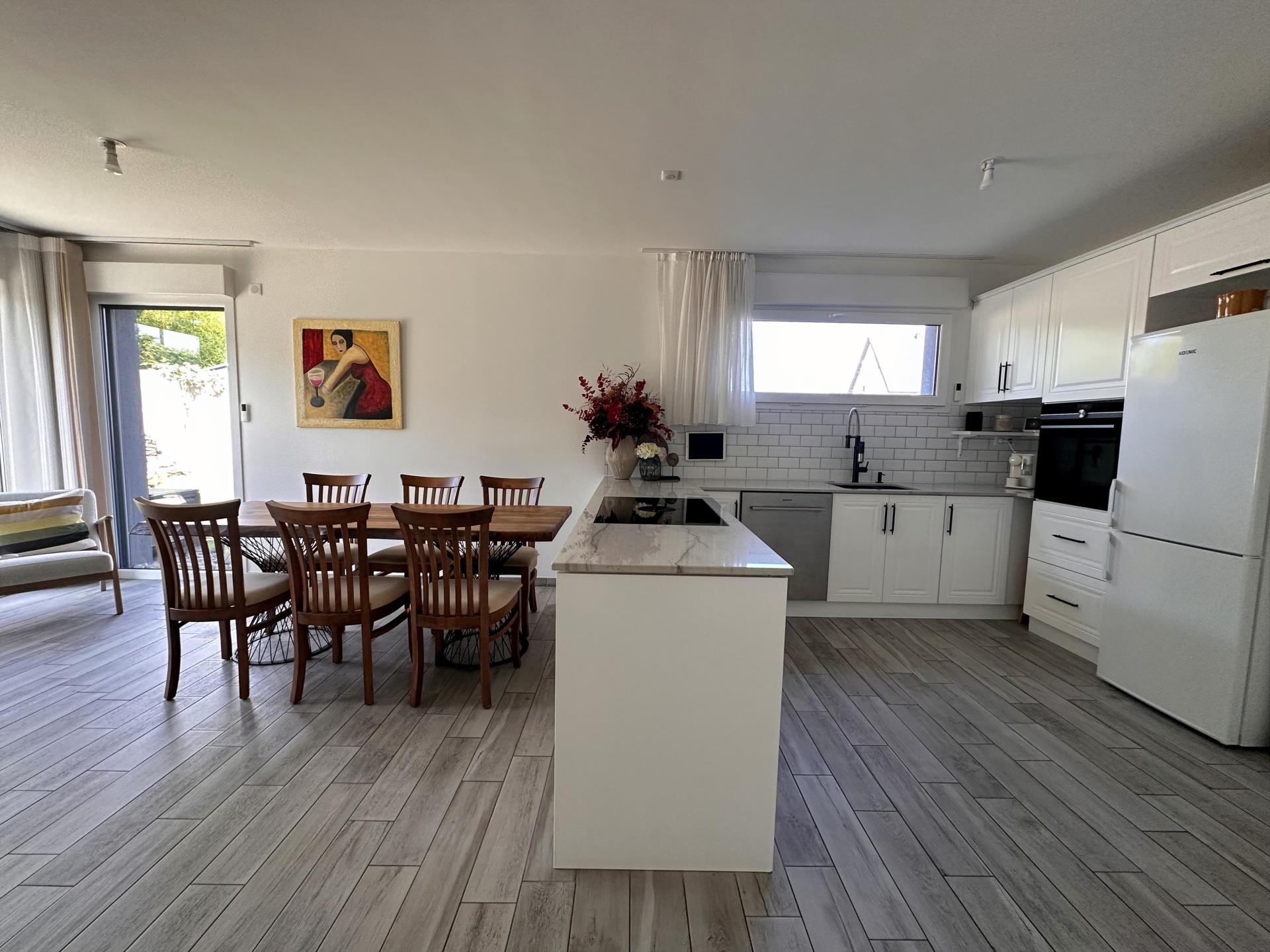 Entrée élégante, salle d'eau avec douche et WC, vaste pièce de vie lumineuse avec salon/séjour et cuisine équipée haut de gamme (plan de travail en granit), ouverte sur le jardin via de grandes baies vitrées. Chauffage au sol.