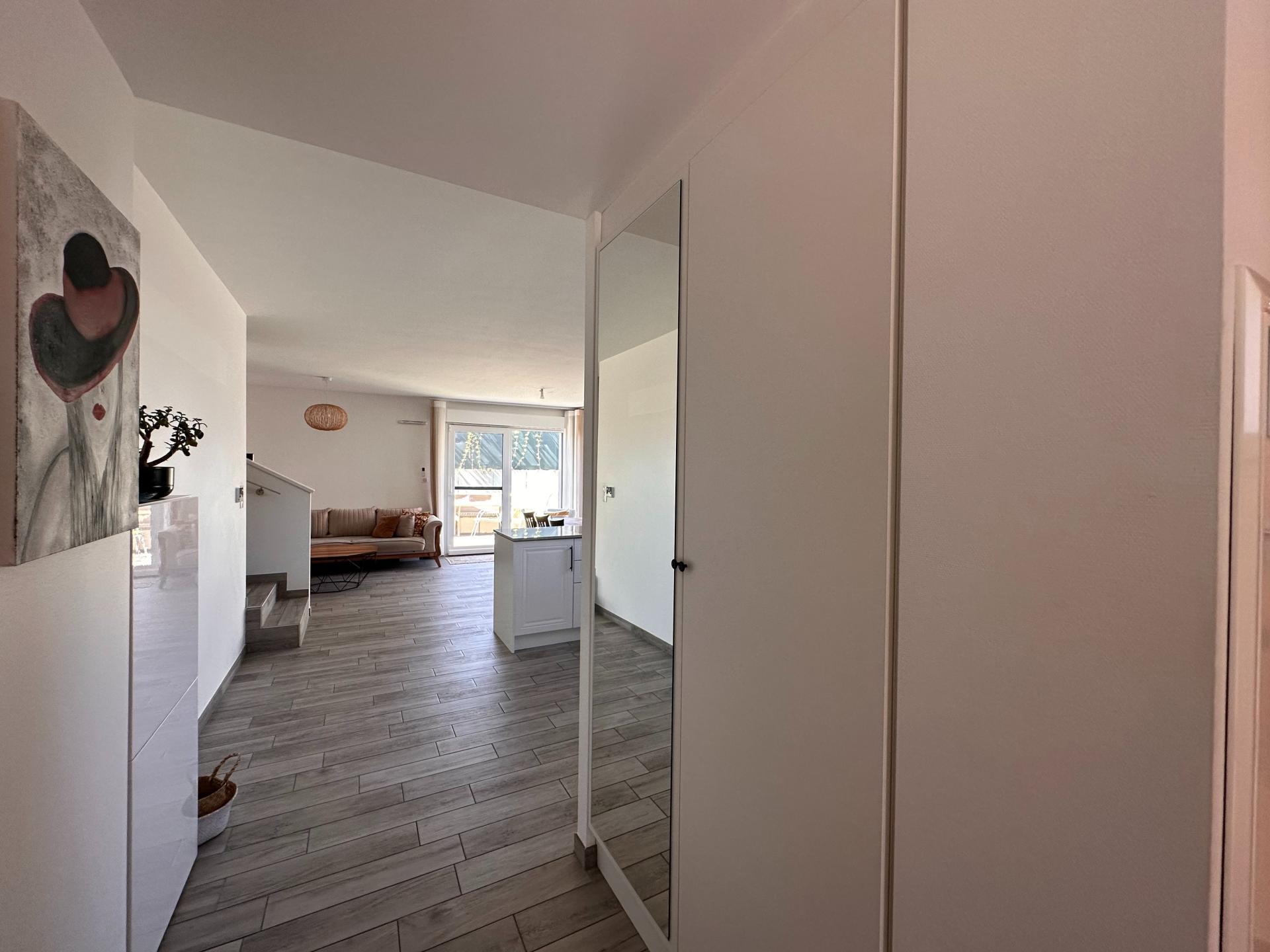 Trois chambres, salle de bain avec baignoire, chauffage au sol, fenêtres PVC triple vitrage pour une excellente isolation.