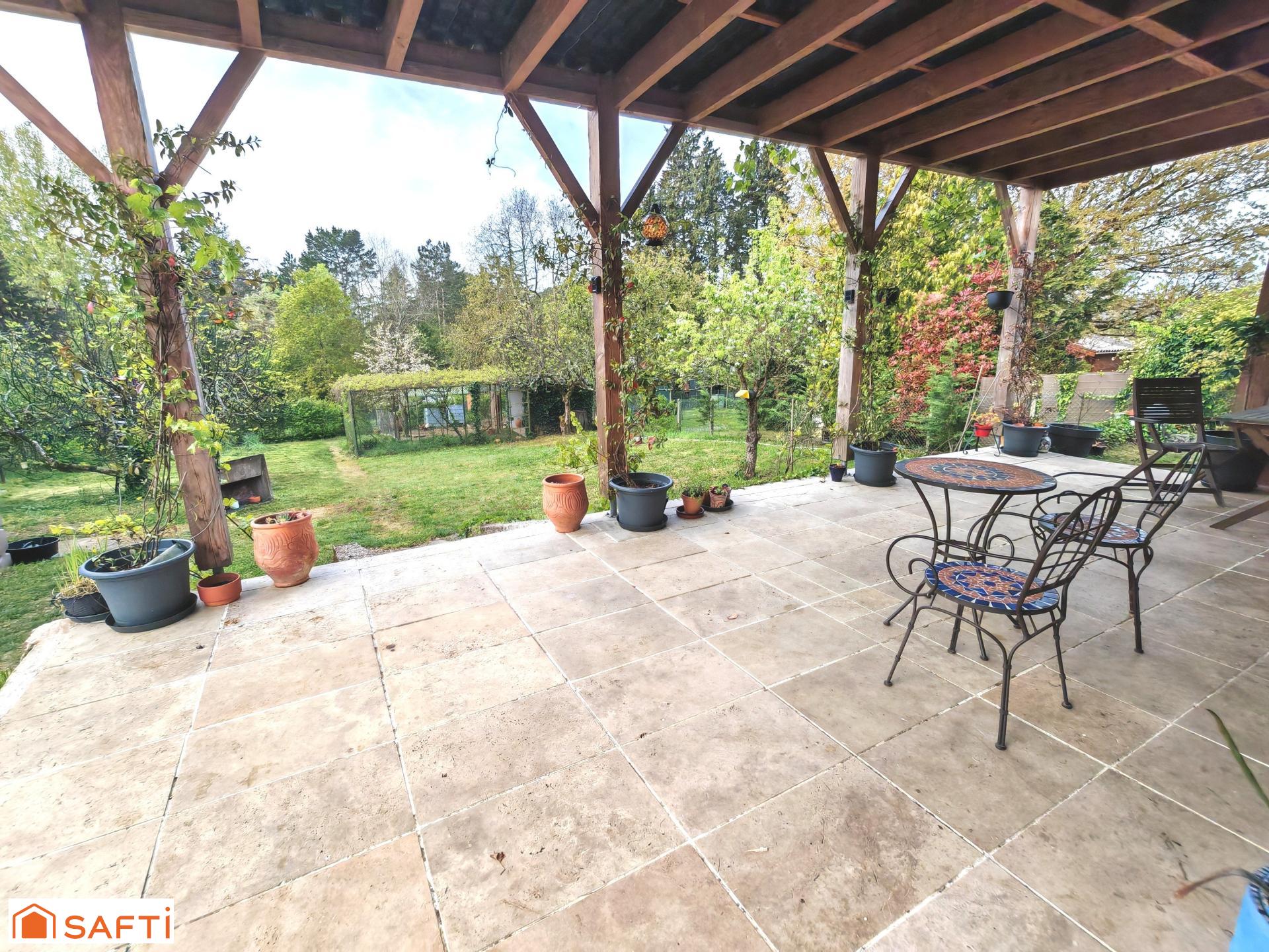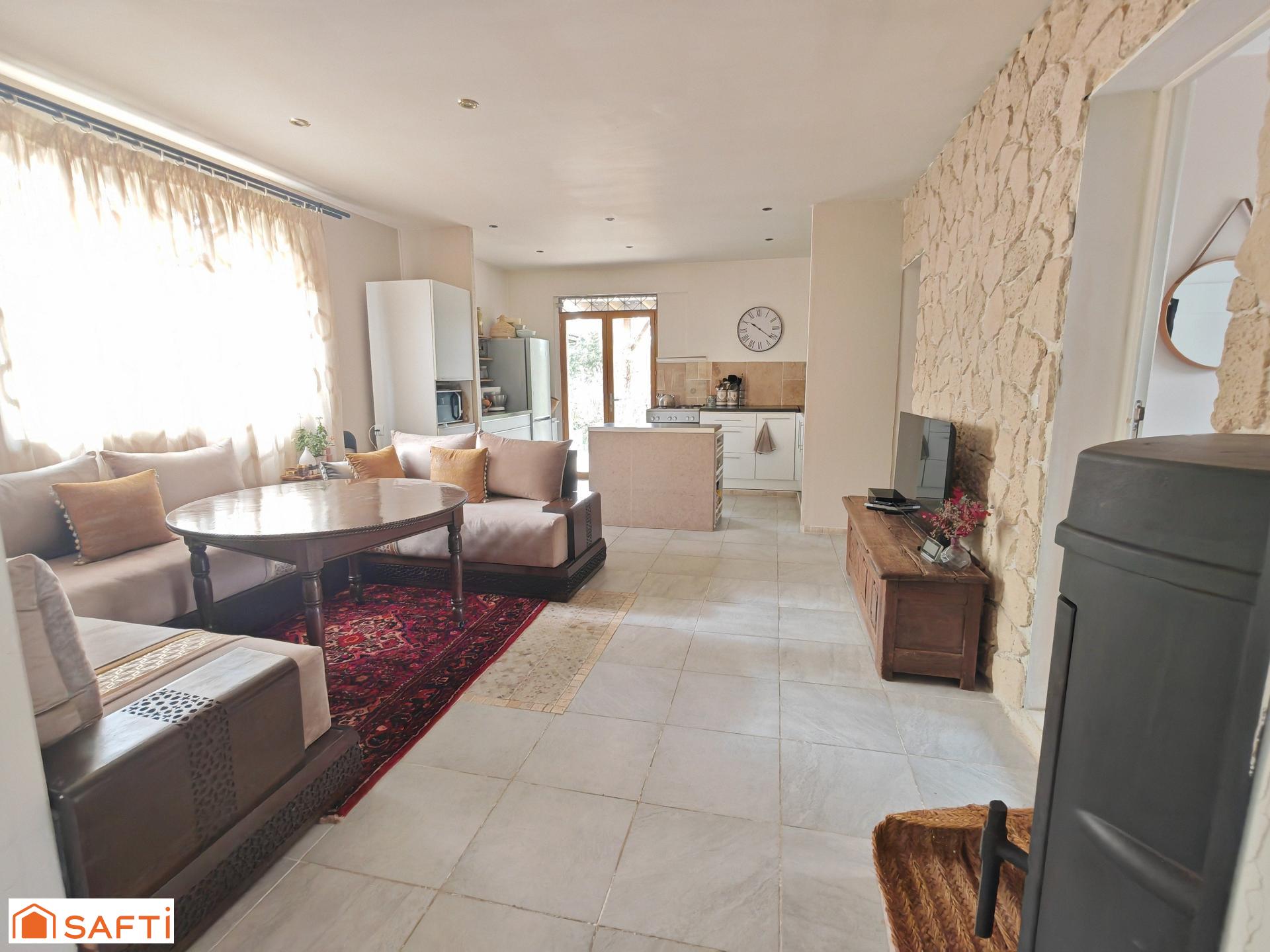 elle offre un séjour lumineux avec une cuisine ouverte qui donne sur une terrasse couverte, vue sur le jardin.