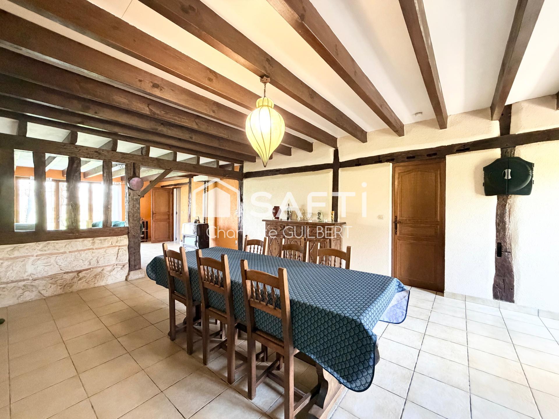 À l’extérieur, un vaste terrain d’environ 7 800 m² entoure la maison, parfait pour les amoureux de nature. Vous y trouverez un séchoir à tabac, un puits et un atelier, offrant de nombreuses possibilités d’aménagement ou de stockage.