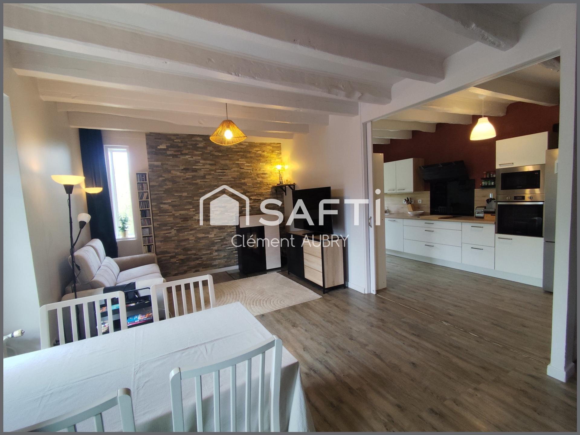 Maison se compose d'un salon-séjour agrémenté d’un poêle à pellets, offrant une ambiance chaleureuse et conviviale et ouverte sur une cuisine aménagée et entièrement équipée, WC.