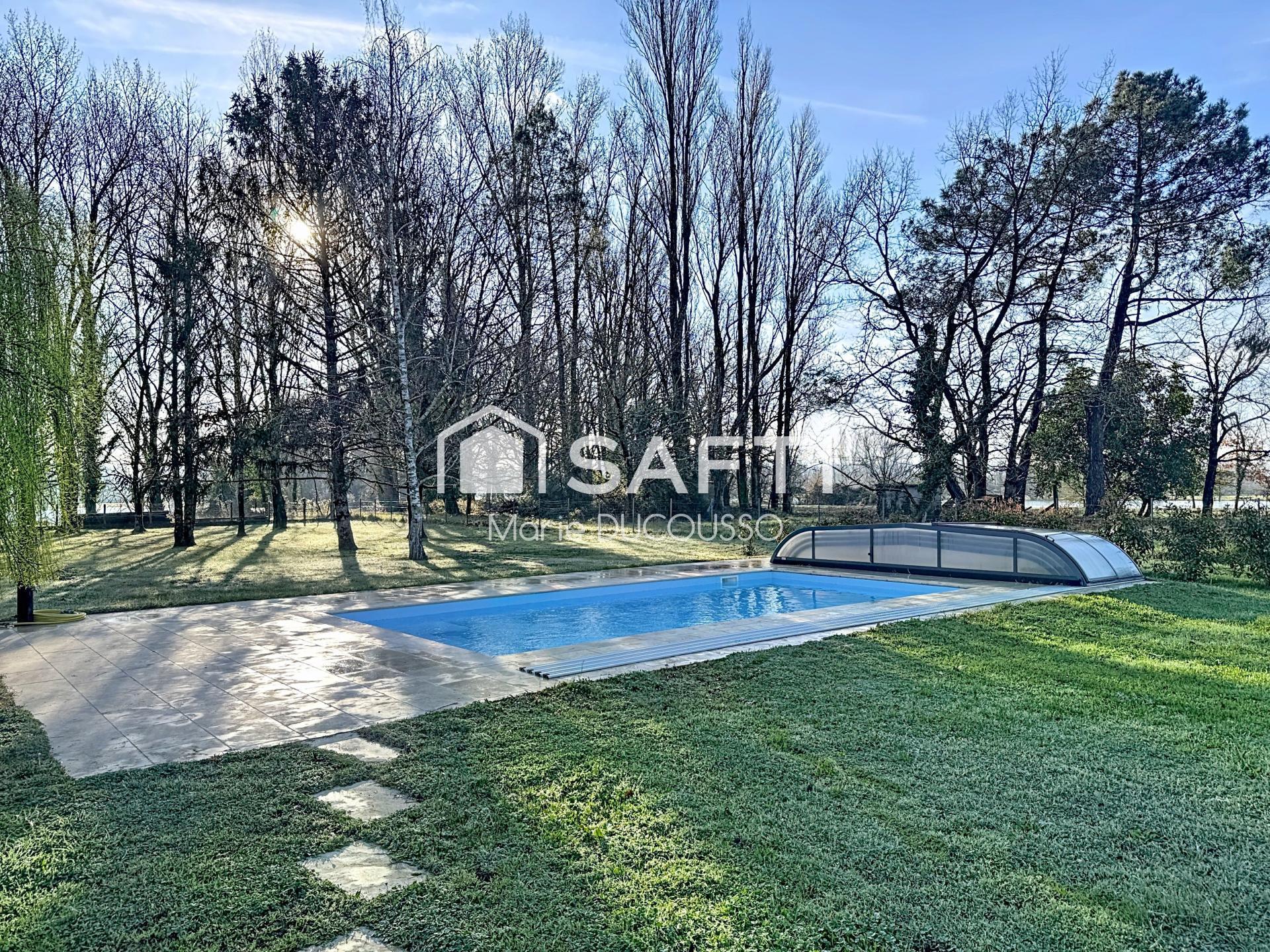 105 m² rénovés, 3 ch + suite, potentiel 4e, parc 5 700 m² sans vis-à-vis, piscine chauffée avec dôme, garage 50 m².