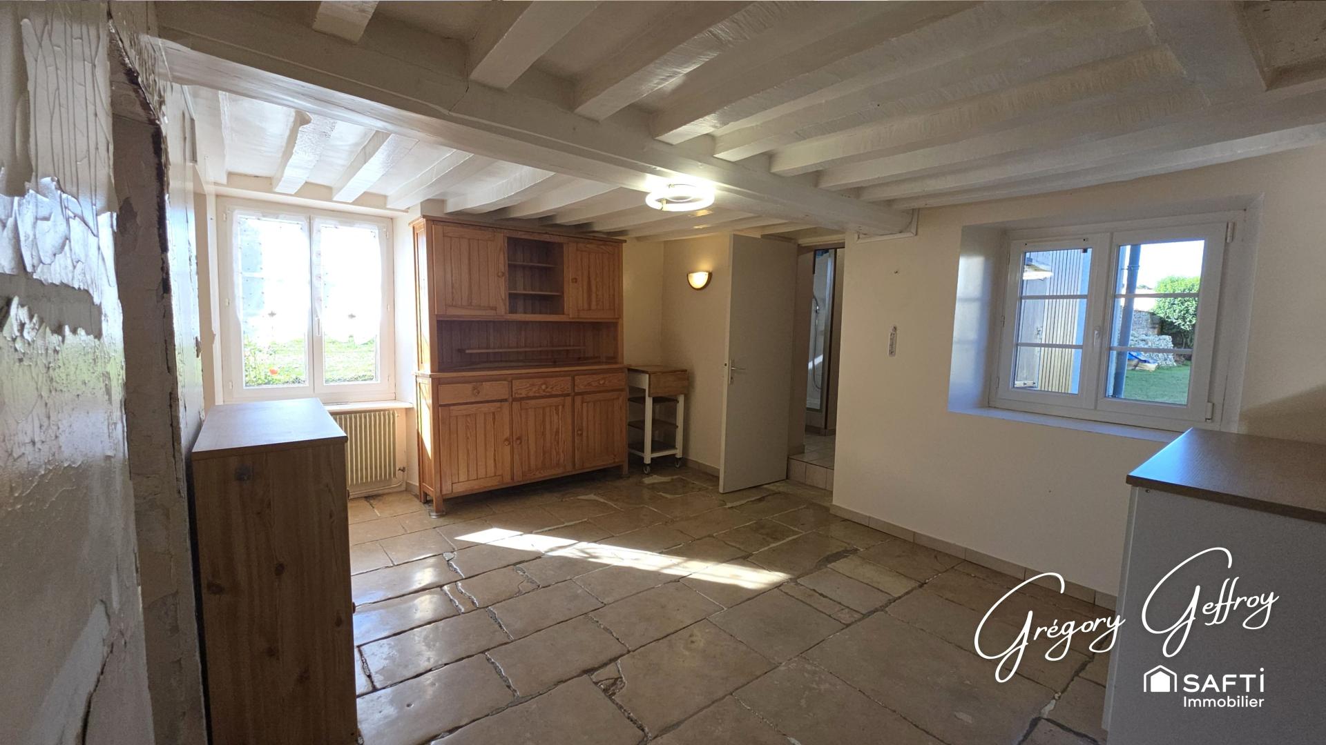 Grégory GEFFROY, votre conseiller en immobilier SAFTI, vous présente cette charmante propriété composée d'une longère d'une surface habitable d'environ 113m² accompagnée de ses dépendances,