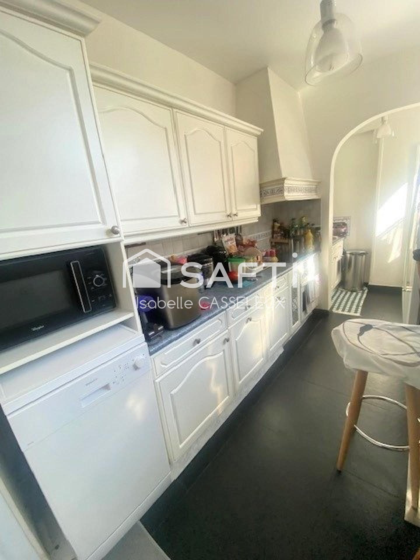 D’une surface d'environ 10 m², la cuisine aménagée bénéficie de deux fenêtres et reste indépendante tout en étant connectée à la pièce de vie grâce à une porte vitrée.
