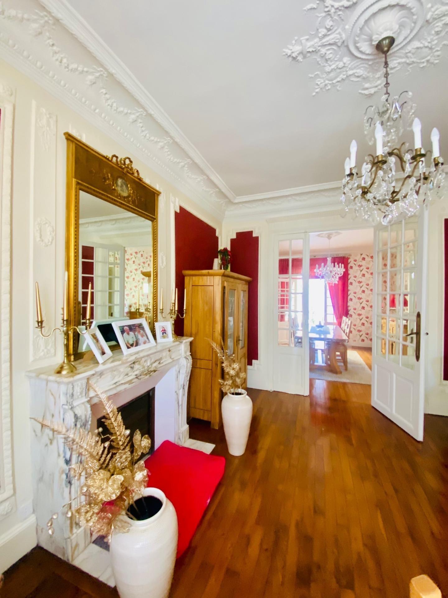 À l'intérieur, cette maison de 260 m² se répartit sur trois niveaux offrant des pièces spacieuses et lumineuses. Le rez-de-chaussée comprend un double salon, une salle à manger, une véranda, une cuisine équipée, une buanderie, un wc. Le premier accueille trois chambres dont une avec salle de bain privative, tandis que le deuxième étage dispose d'une chambre supplémentaire. Les matériaux nobles tels que les moulures, les parquets en bois d'Hongrie ajoutent un charme certain à cette demeure.