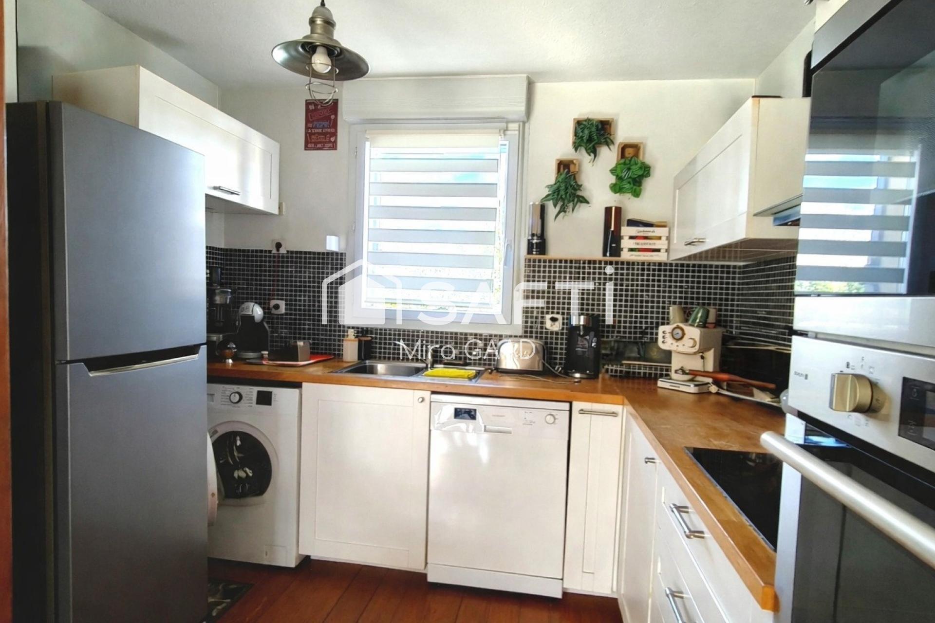 Une grand salon salle à manger , une salle de bain , un toilette séparé , une belle cuisine équipée ouverte .