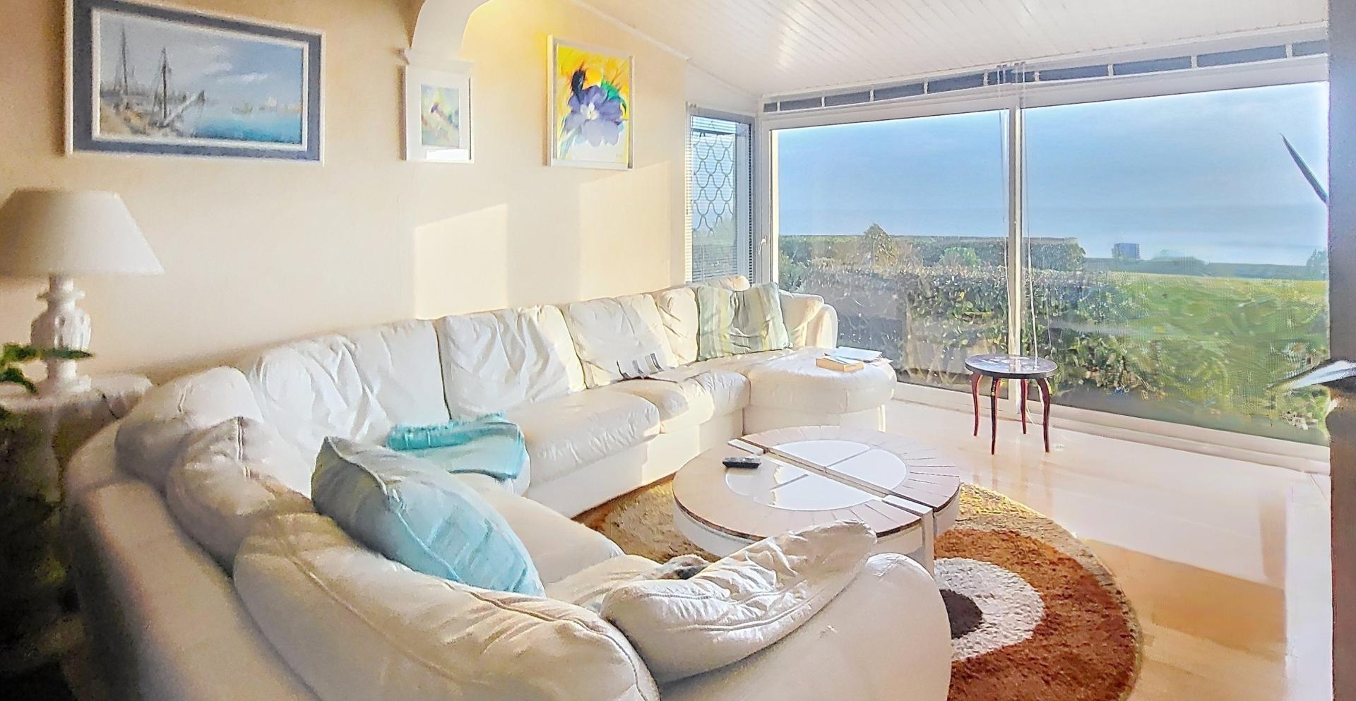 Dans le prolongement, un deuxième espace entièrement vitrée offre une vue spectaculaire à 180° sur l’océan, véritable tableau vivant qui évolue au rythme des marées. Son exposition plein sud permet de profiter pleinement de la lumière naturelle tout au long de la journée.