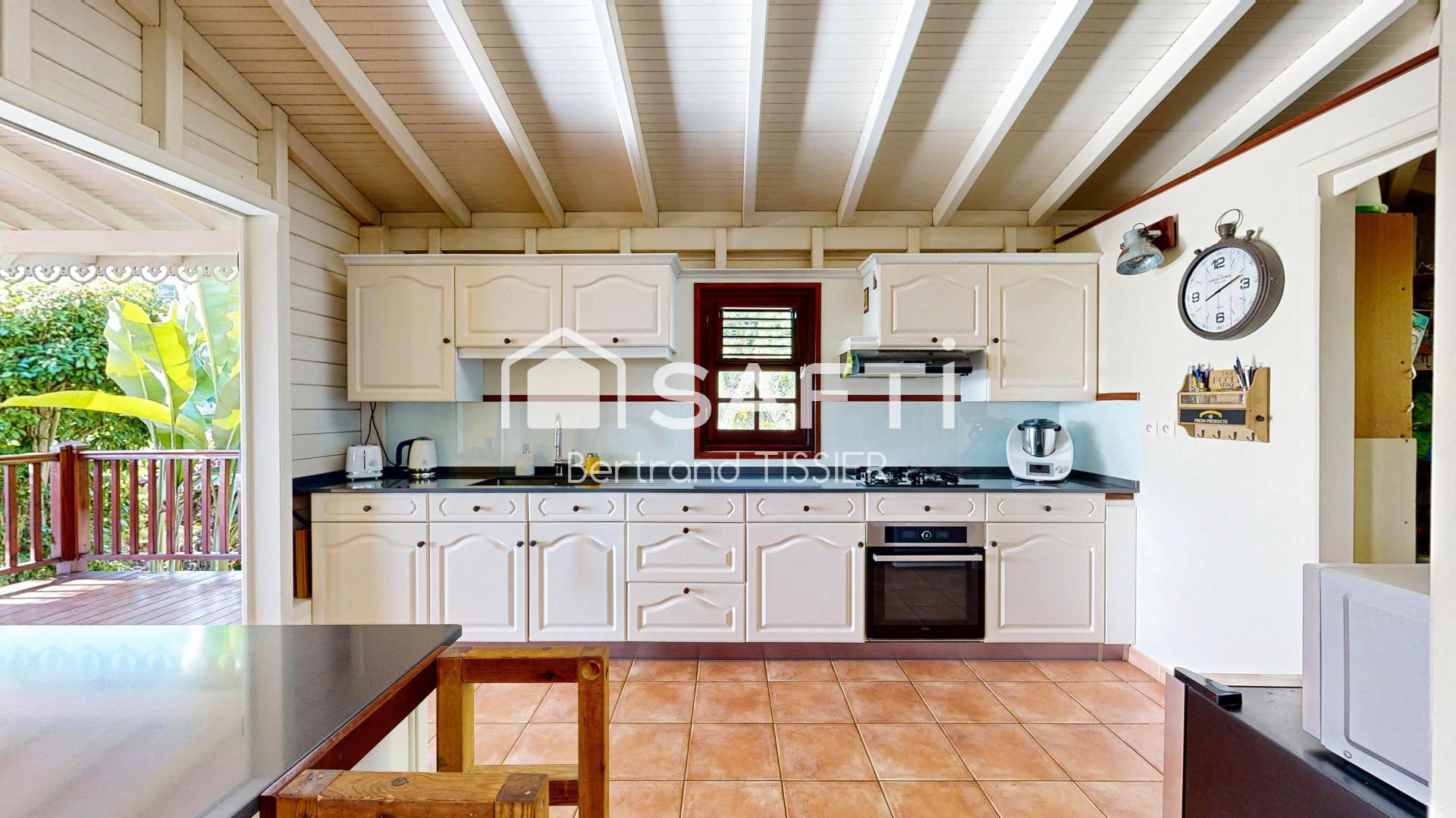 Bertrand Tissier vous propose en exclusivité cette superbe maison en bois, idéalement située dans le lotissement recherché Rose des Vents à Sainte-Marie et à 5 minutes de Trinité. Édifiée sur un terrain de 1346 m² offrant un réel potentiel de développement, cette propriété parfaitement entretenue séduit par son cachet et sa fonctionnalité. Elle se compose de trois chambres dont une belle suite parentale avec salle de bain privative, d'une seconde salle de bain indépendante, d'une grande mezzanine polyvalente, d'une vaste pièce de vie lumineuse, d'une cuisine aménagée avec son arrière-cuisine, d’une terrasse couverte et d’une grande terrasse extérieure prolongée par un large deck en bois. La piscine bénéficie d’une vue mer spectaculaire, véritable atout de ce bien d’exception. Aucun travaux à prévoir : tout est prêt pour vous accueillir dans un confort total. Ce bien rare conjugue charme, volumes, qualité de construction et environnement privilégié. À visiter sans attendre ! Visite 3D disponible