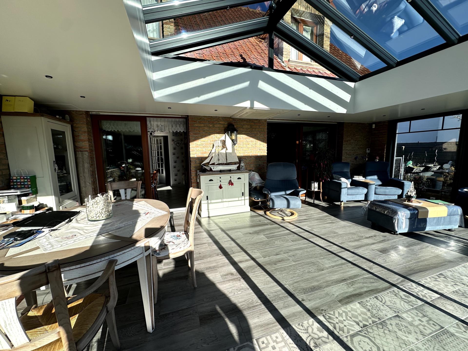 La véranda a été construite il y a tout juste dix ans et vient ajouter un volume supplémentaire de 30 m2. Elle possède pour cette pièce une pompe à chaleur réversible. La structure est en aluminium et possède des vitres au plafond auto-nettoyante.