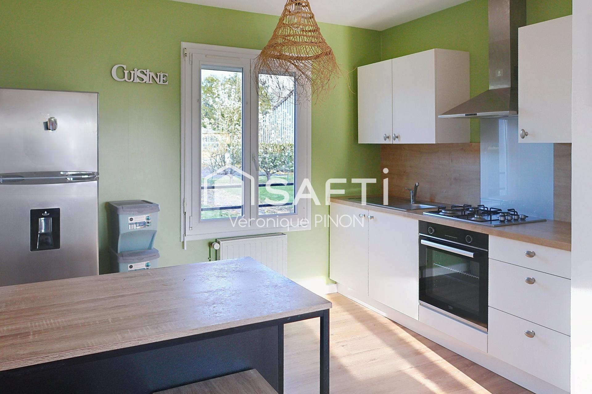 La pièce principale d'une surface de 33 m2 est baignée de lumière. Le coin salon est orné d'un poêle à pellets et la cuisine récente est aménagée et équipée.