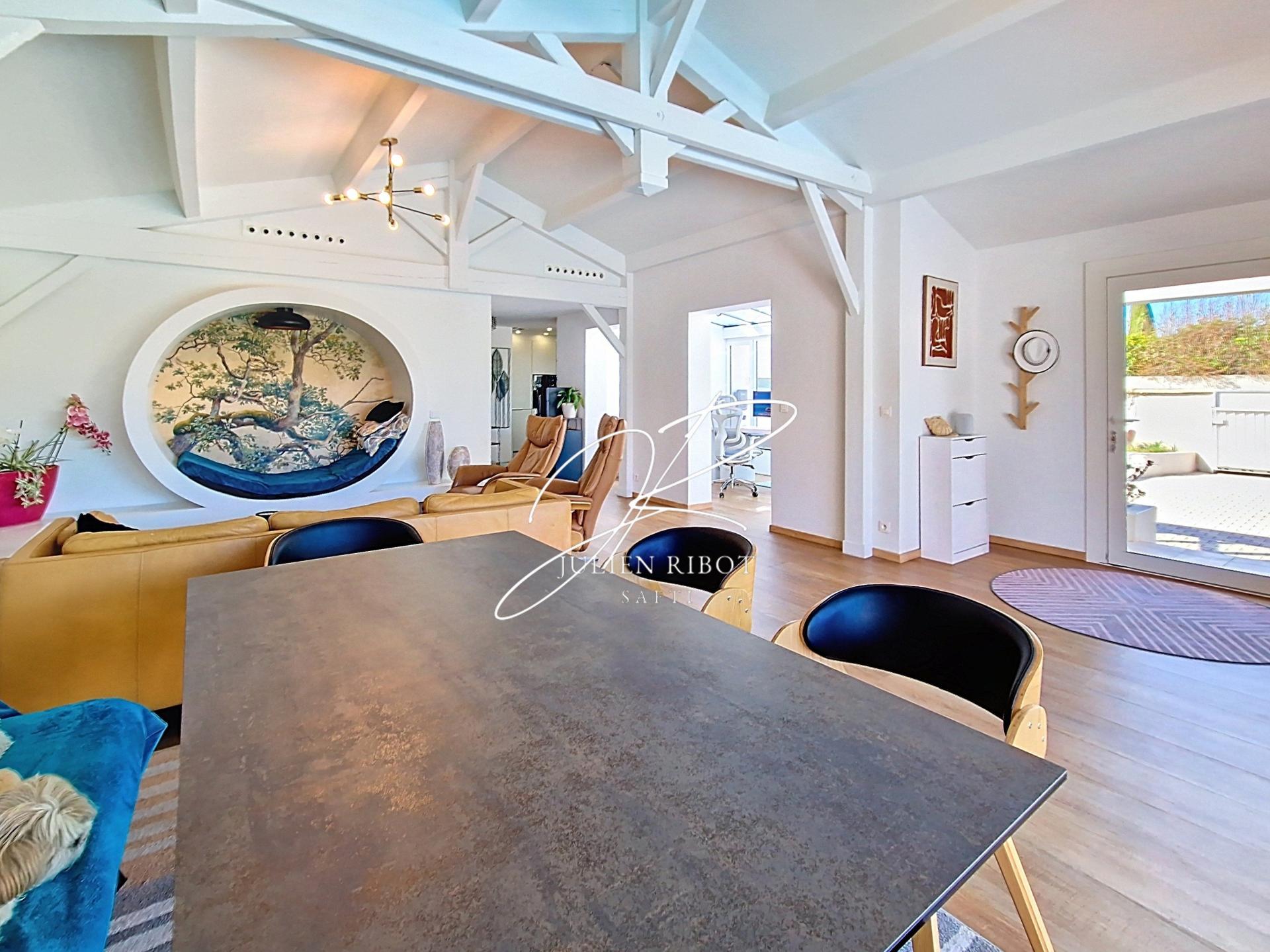Dès l’entrée, vous découvrirez une magnifique pièce de vie baignée de lumière, sublimée par une superbe charpente apparente qui lui confère beaucoup de cachet. Un espace bureau a été aménagé dans une élégante verrière, apportant une touche contemporaine et fonctionnelle. La cuisine, semi-ouverte et entièrement équipée, s’intègre harmonieusement à cet espace convivial.