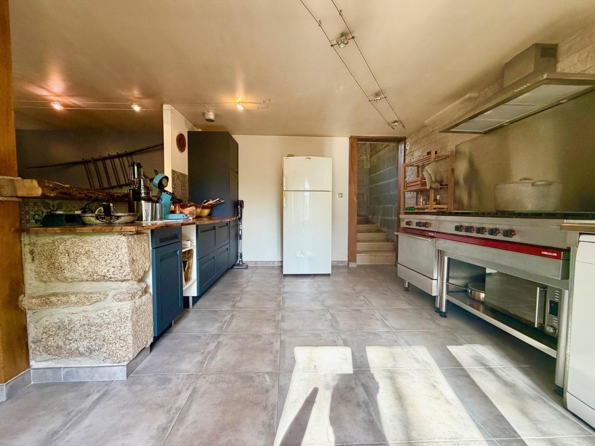 La maison est composée au rez-de-chaussée d'une cuisine aménagée-équipée, ouverte sur le salon-séjour, d'une chambre avec poêle à bois et à l'étage de 3 chambres, d'une salle de bain et d'un wc indépendant.