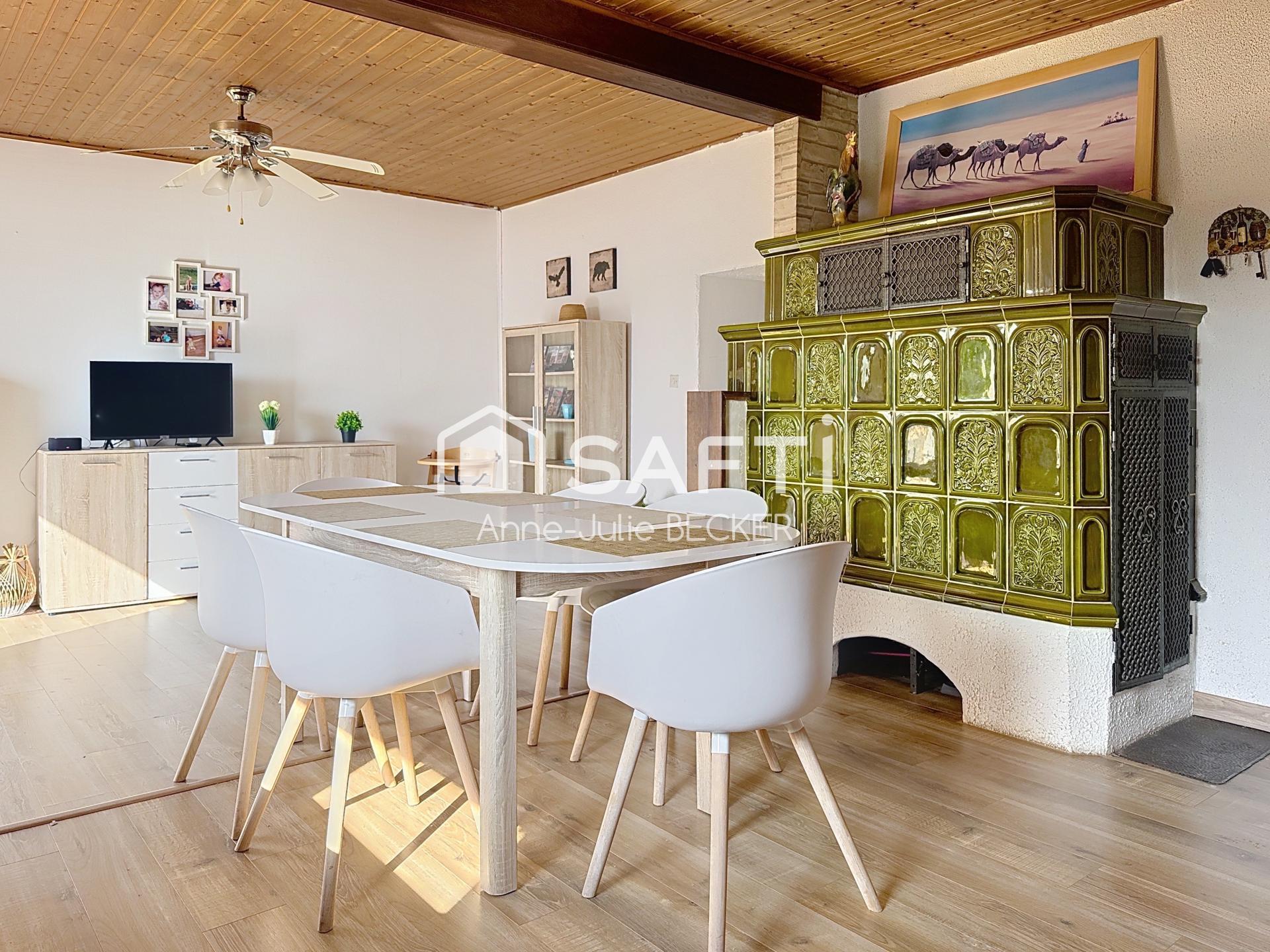 Côté confort, le chauffage électrique est complété par un poêle alsacien en faïence, véritable pièce maîtresse du séjour, qui confère aux lieux une touche d’authenticité et de chaleur.