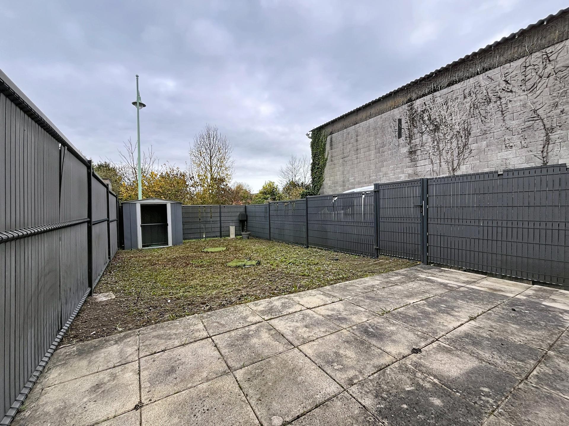 Le jardin est entièrement clôturé avec un espace terrasse en dalle béton. Un petit cabanon complète le jardin pour le rangement.