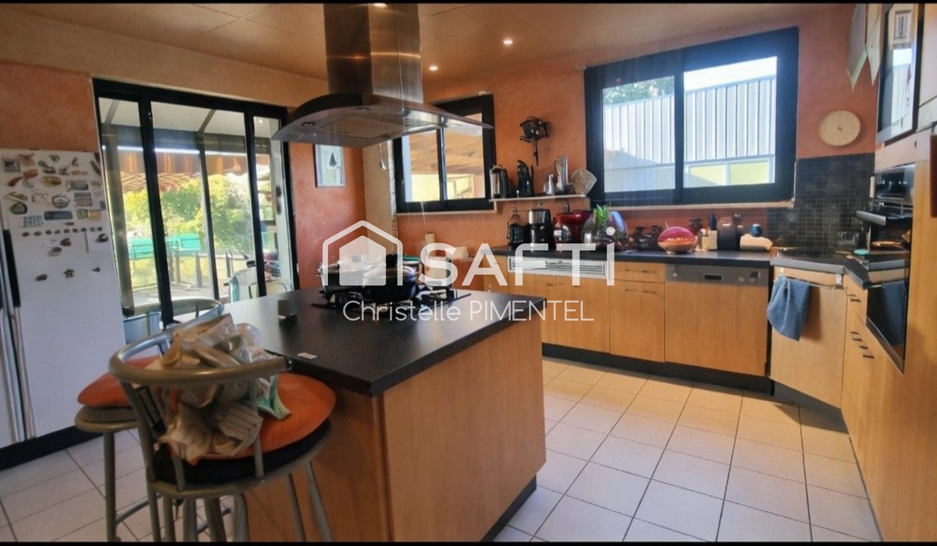La cuisine, spacieuse et conviviale avec son îlot central, permet de partager des moments en famille tout en profitant d’un accès direct vers l’extérieur.