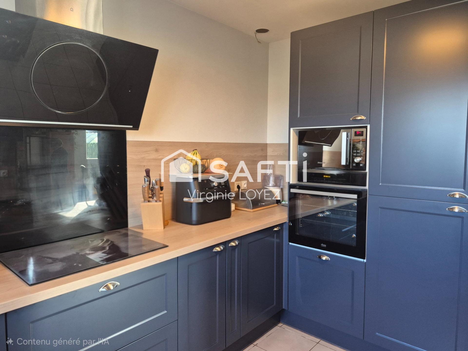 Cette maison de 100 m² sur un terrain de 481 m² , construite en 2012, présente un agencement optimal avec 6 pièces dont 3 chambres. Dotée d'une cuisine récente et entièrement équipée, d'un garage et d'un cellier (trappe d'accés dans les combles avec espace de rangement supplémentaire), elle offre des espaces fonctionnels pour une vie quotidienne harmonieuse. La climatisation réversible dans toutes les pièces assure un confort thermique tout au long de l'année, tandis que le poêle à bois orientable ajoute une touche chaleureuse à l'ensemble. Ce bien allie confort, modernité et praticité, offrant ainsi un cadre de vie idéal pour une famille en quête de sérénité. Terrasse carrelée avec store éléctrique.