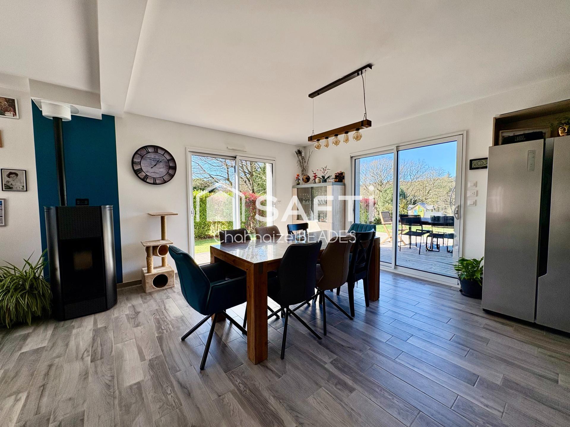 L'entrée s’ouvre sur une belle pièce de vie spacieuse et très lumineuse, comprenant salon avec poêle à granulés, salle à manger et cuisine ouverte aménagée et équipée. Les nombreuses ouvertures et baies vitrées créent une vraie continuité entre l’intérieur et l’extérieur, rendant la pièce particulièrement agréable à vivre au quotidien.