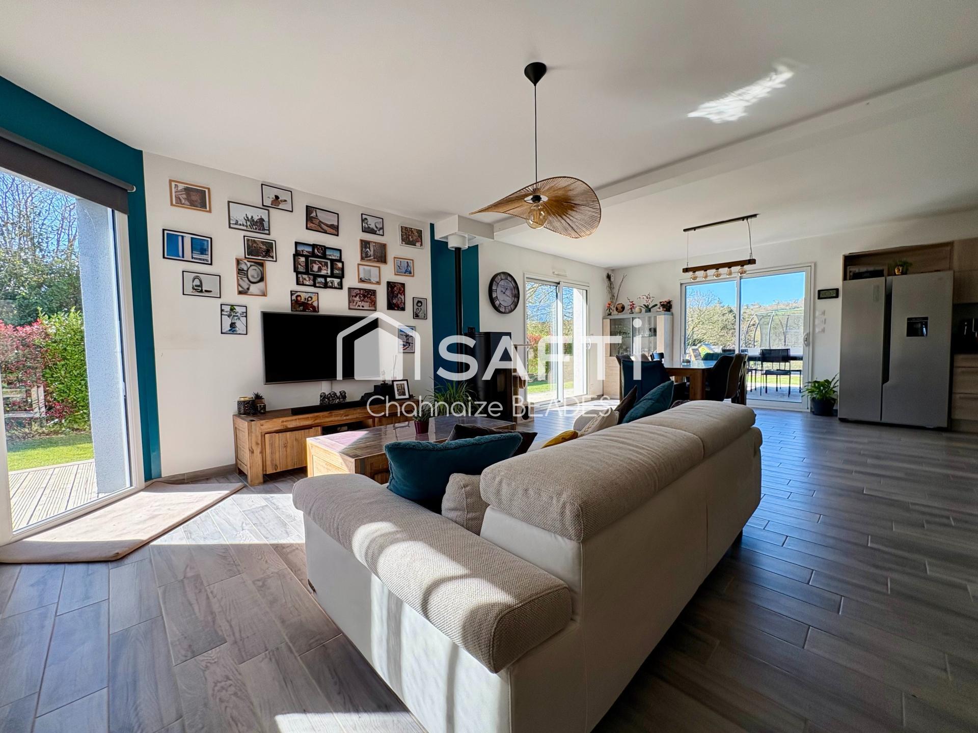 L'entrée s’ouvre sur une belle pièce de vie spacieuse et très lumineuse, comprenant salon avec poêle à granulés, salle à manger et cuisine ouverte aménagée et équipée. Les nombreuses ouvertures et baies vitrées créent une vraie continuité entre l’intérieur et l’extérieur, rendant la pièce particulièrement agréable à vivre au quotidien.
