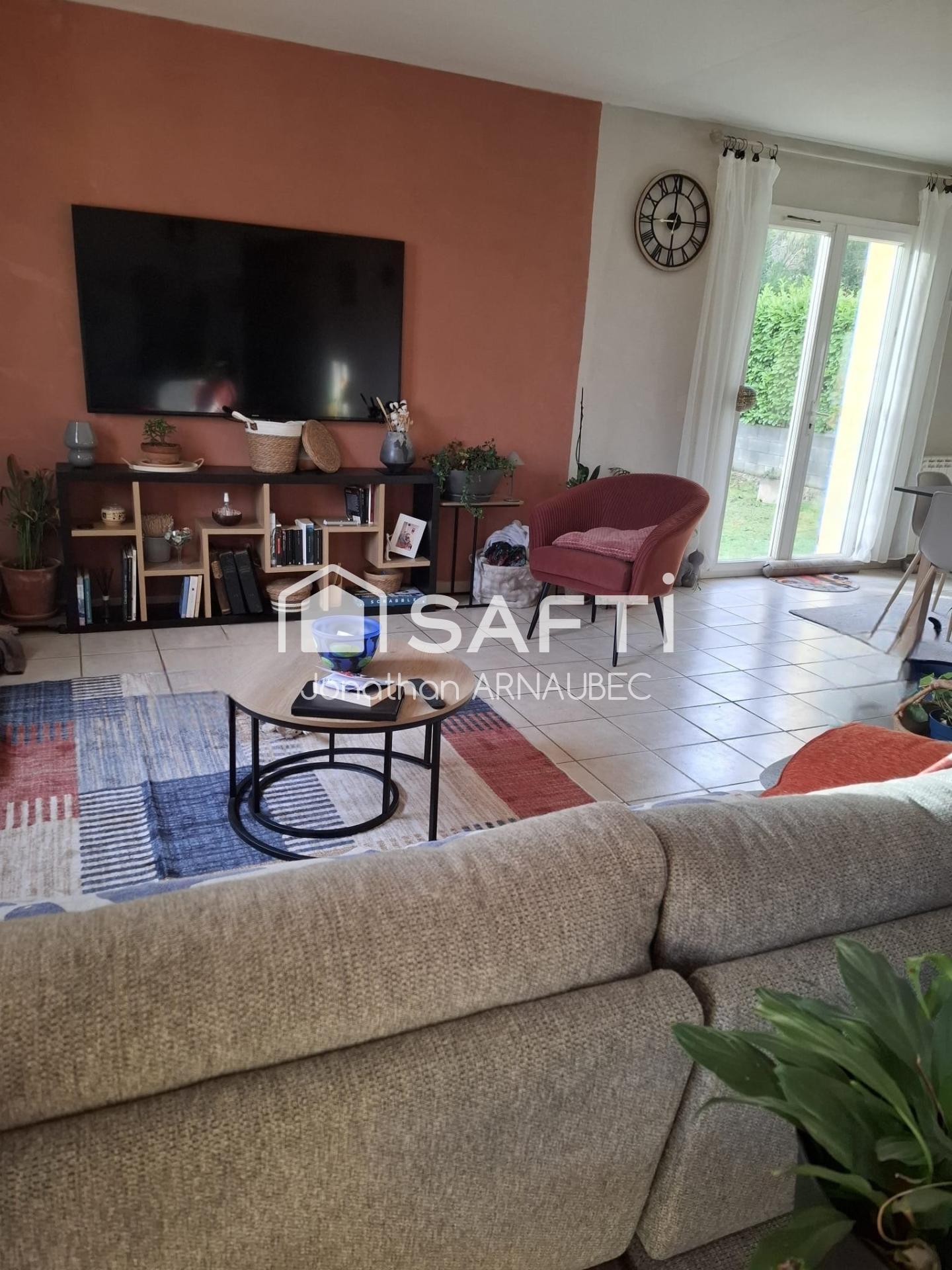 À l’extérieur, le jardin arboré, clos avec portail électrique, bénéficie de l’eau du canal pour l’arrosage, offrant un cadre agréable et pratique au quotidien, possibilité de faire une piscine.