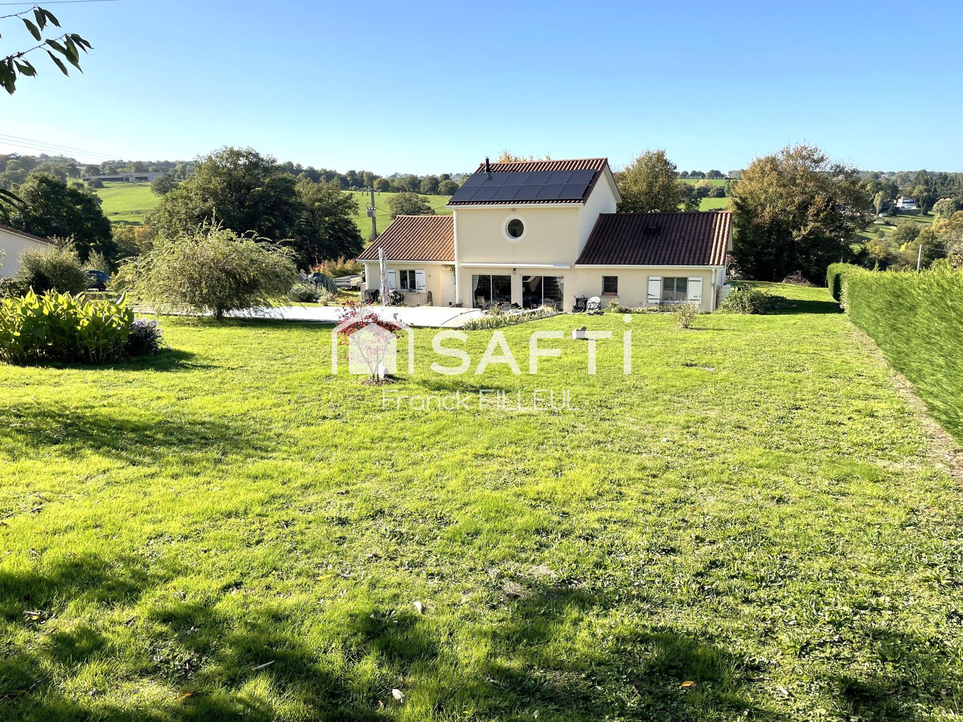 !! DÉJÀ SOUS OFFRE AU PRIX acceptée!!A 3 min du bourg et de ses commerces et services, ramassage scolaire tout proche, 10 min de Limoges et de l'A20, cette très jolie maison est bien située d'autant qu'elle bénéficie aussi d'un environnement splendide avec panorama sur la vallée de la Briance. Elle est bien pensée avec une pièce à vivre de 51 m² dont une cuisine ouverte et surmontée d'une grande mezzanine. Celle-ci est aujourd'hui un bureau/bibliothèque et chambre d'appoint, elle pourrait être transformée en suite. Ce "coin jour" lumineux donne sur la terrasse, la piscine couverte et le magnifique parc entièrement clos. Le coin nuit comporte 3 chambres, 1 dressing, 1 salle de bain avec baignoire et douche italienne et un wc fermé. Cette maison bien isolée, moderne est également économique: une pompe à chaleur neuve avec son plancher chauffant, un poêle à bois, des panneaux photovoltaïques neufs amènent confort et économies.Enfin son double garage est idéal pour les voitures et réserve encore de la place. A visiter vite!