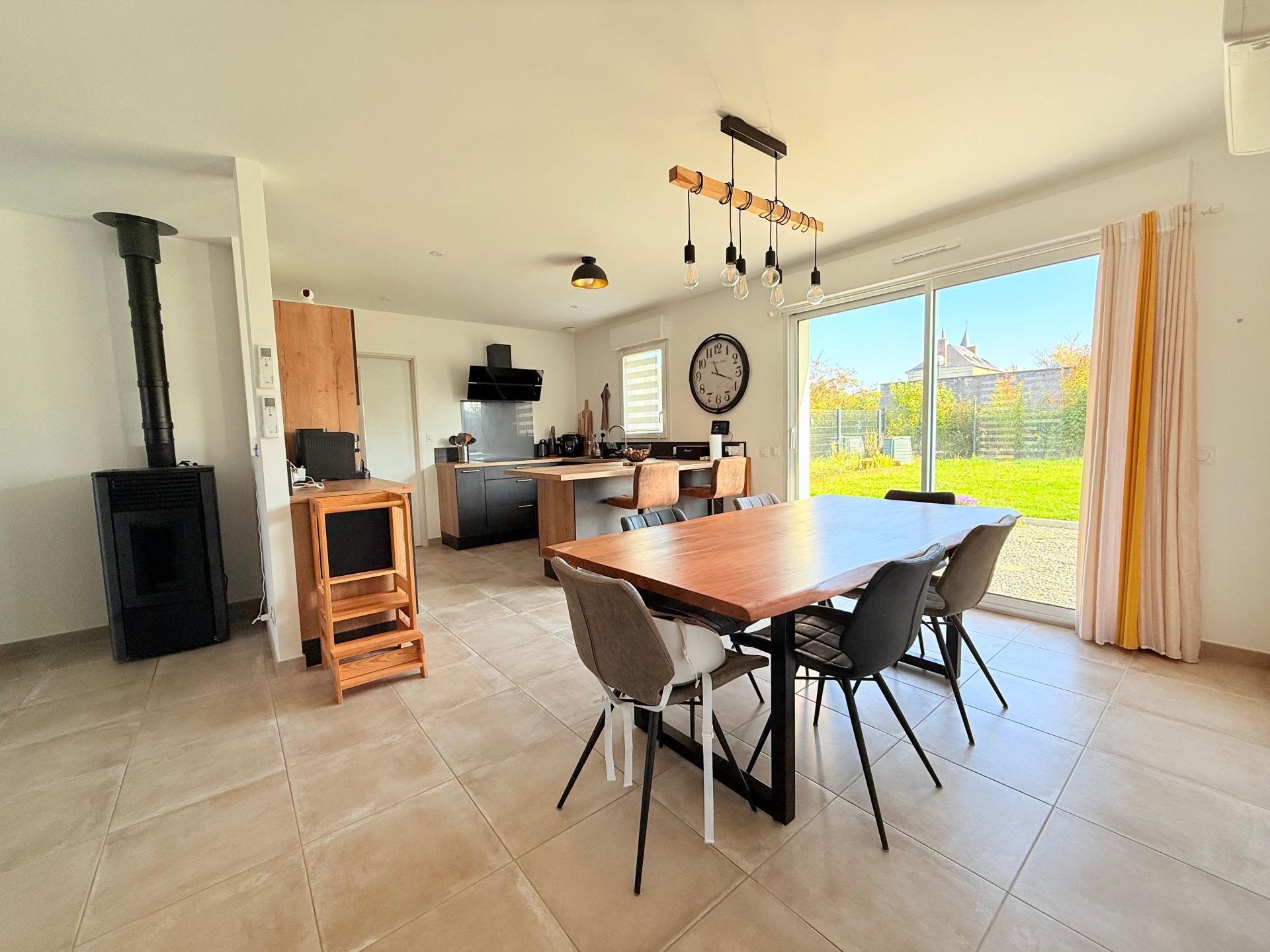 Seulement à 25 minutes de Tours nord, Sonzay maison de 03/2022 plain pied, fonctionnelle et bien distribuée, centre bourg proximité des commodités, comprenant une cuisine équipée et aménagée donnant sur une pièce de vie (avec poêle à granulés) un cellier, un dégagement menant vers la salle de bain (baignoire, douche à l'italienne, 2 vasques, un sèche serviette) 3 chambres dont une avec dressing, les deux autres avec placards, un garage attenant avec le comble aménageable. Pompe à chaleur réversible, chauffe eau thermodynamique, un adoucisseur. Vide sanitaire sous toute la superficie de la maison. Un cabanon de jardin. L'ensemble sur un terrain de 527 m2 cloturé. Assainissement collectif.