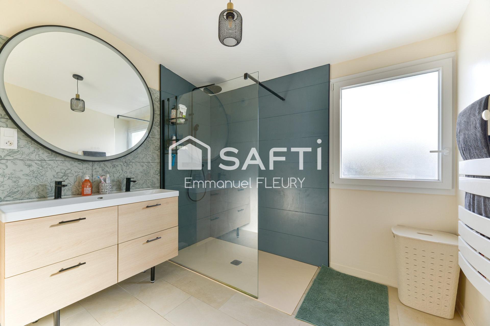 À l’étage, le palier dessert trois chambres confortables ainsi qu’une salle d’eau moderne équipée d’une douche à l’italienne.